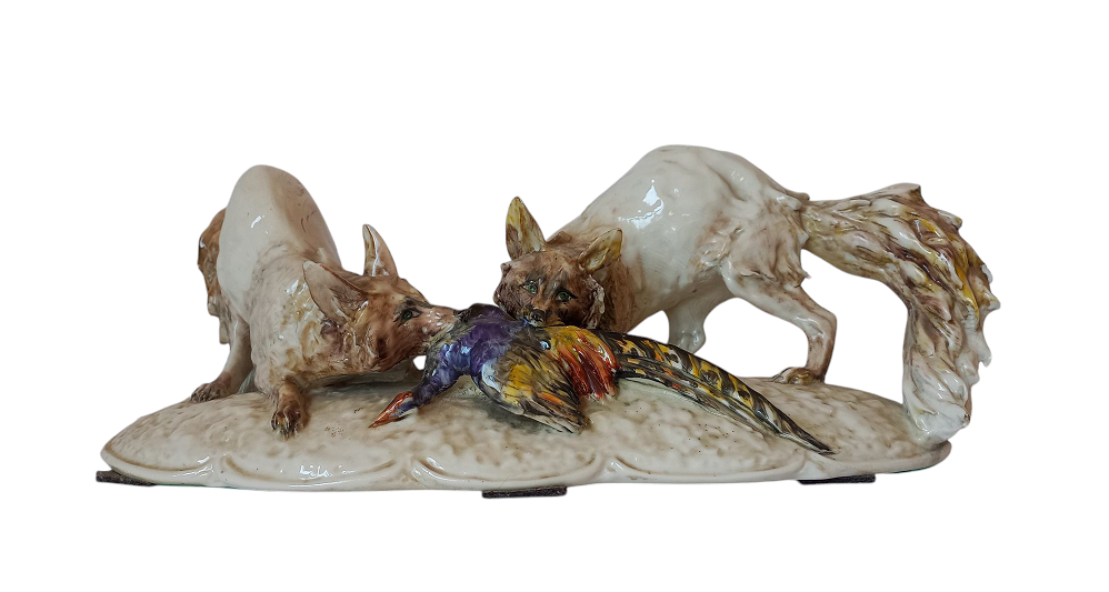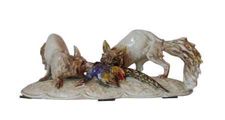 Guido Cacciapuoti (1892-1953) - Volpi che catturano un fagiano - Ceramica policroma cm.36x15 h.12 firmata alla base