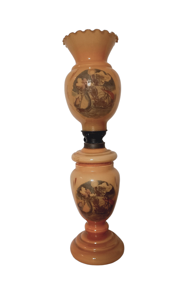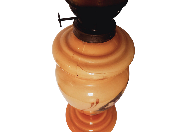 Lume a petrolio in vetro opalino color ocra e metallo decorato con velieri h.cm.56 (difetti)