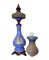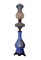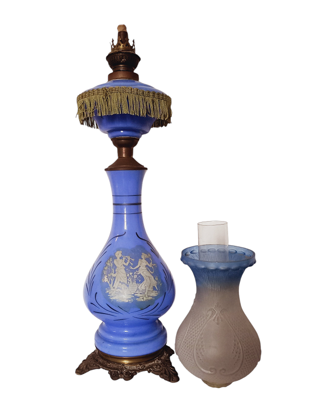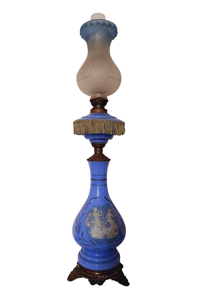 Lume a petrolio in vetro opalino azzurro e metallo decorato in bianco e con...