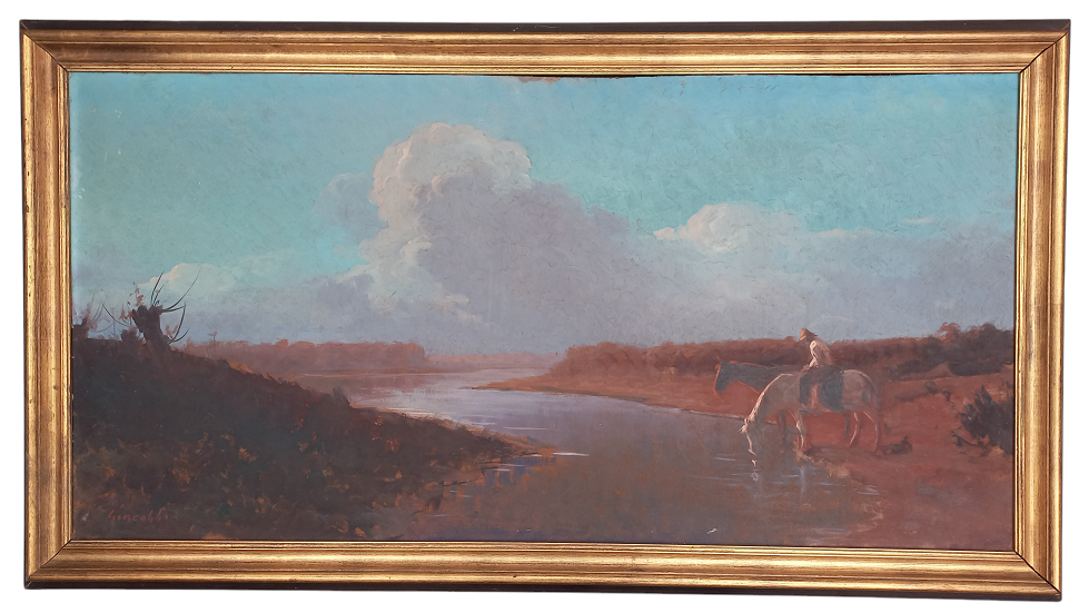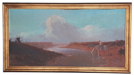 Ernesto Giacobbi (1891-1964) - Paesaggio con cavalli - olio su faesite cm.50x100 firmato in basso a sinistra in cornice