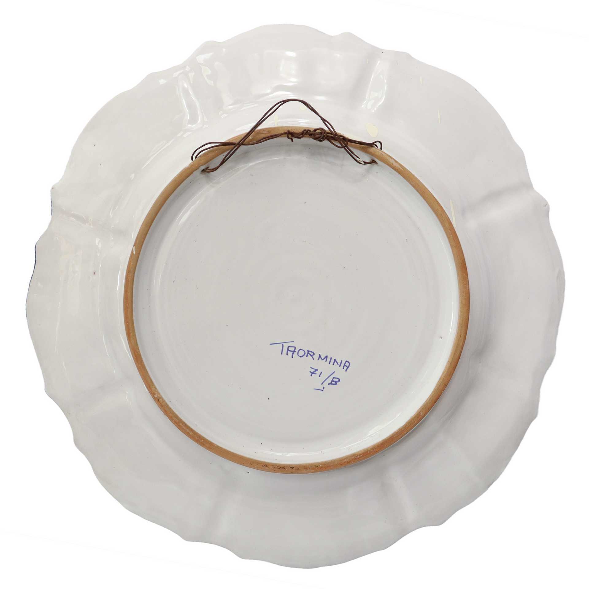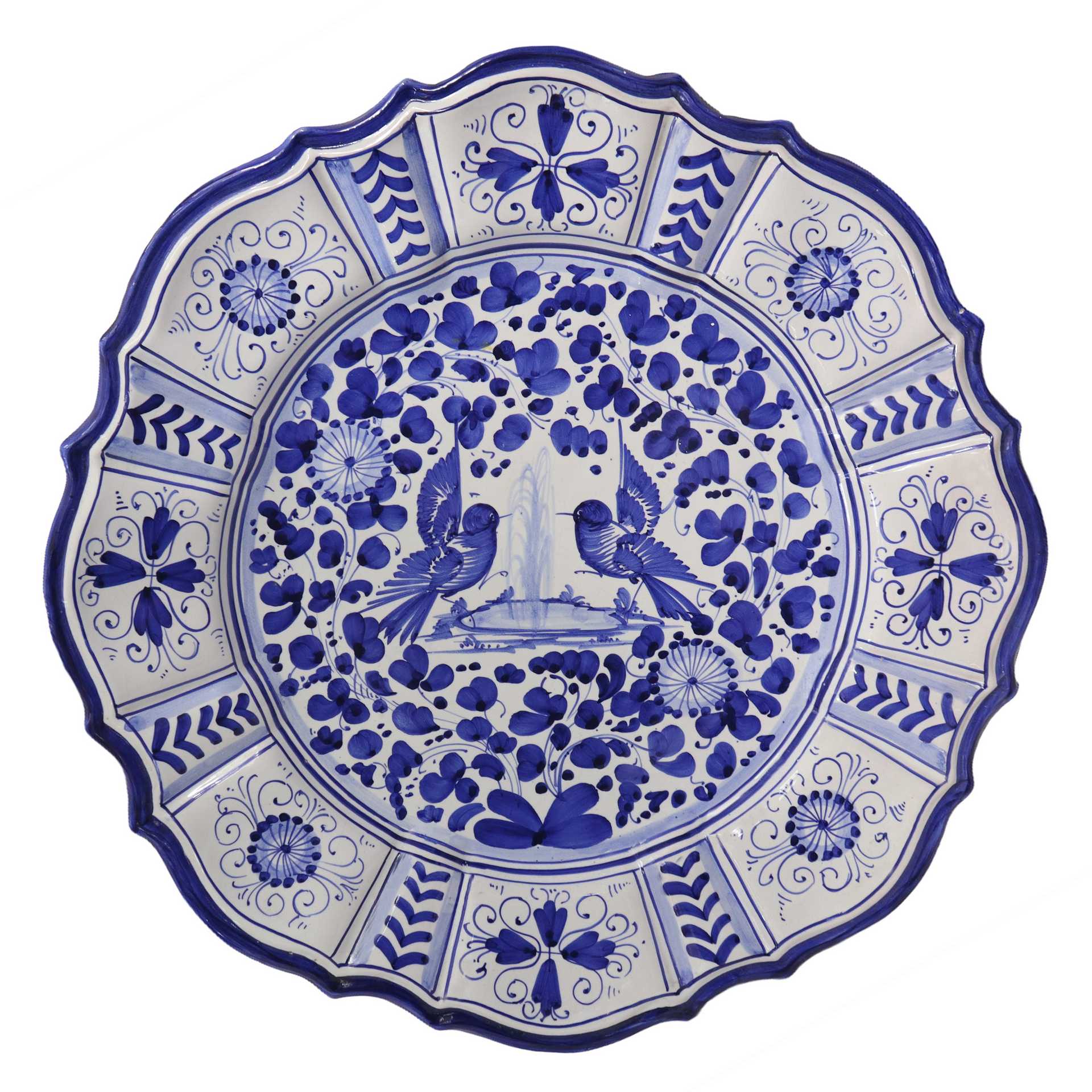 Lot 104 | Piatto da muro smerlato, base bianca, disegni floreali e uccelli nei toni del blu, Taormina