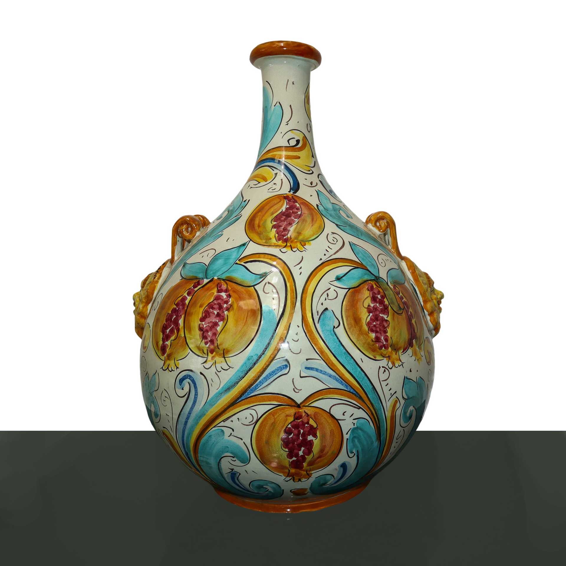 Vaso policromo in maiolica di Caltagirone con prese ai lati a grottesche con raffigurazioni di melograni, 20° secolo h cm 45 circonferenza cm 100