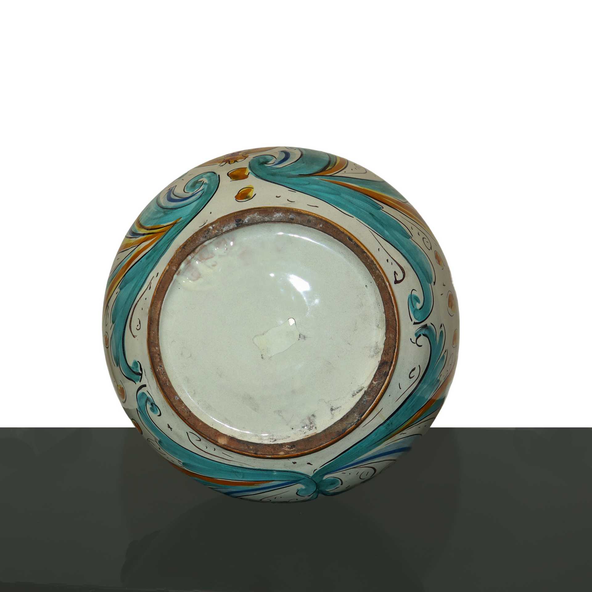 Vaso policromo in maiolica di Caltagirone con prese ai lati a grottesche con raffigurazioni di melograni, 20° secolo