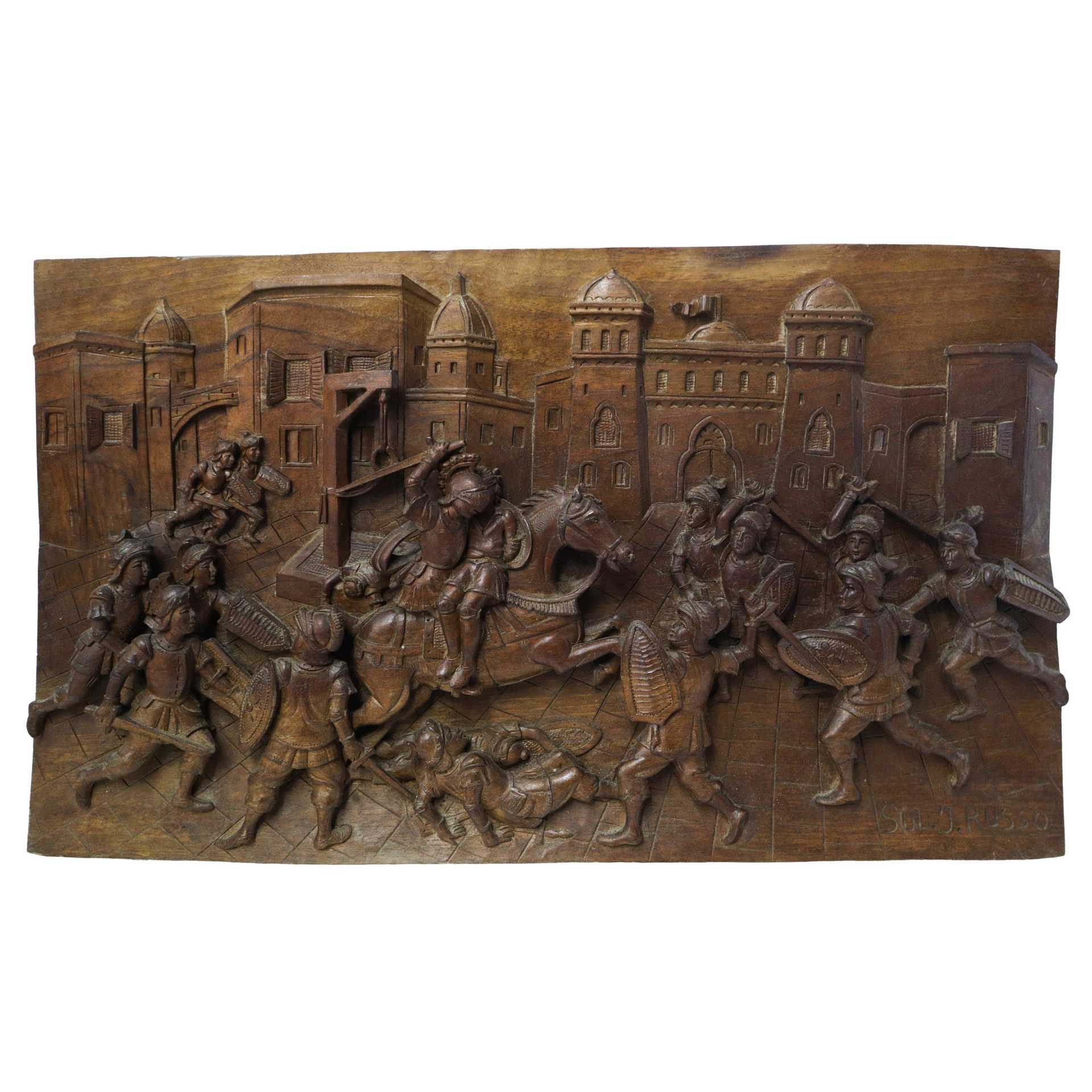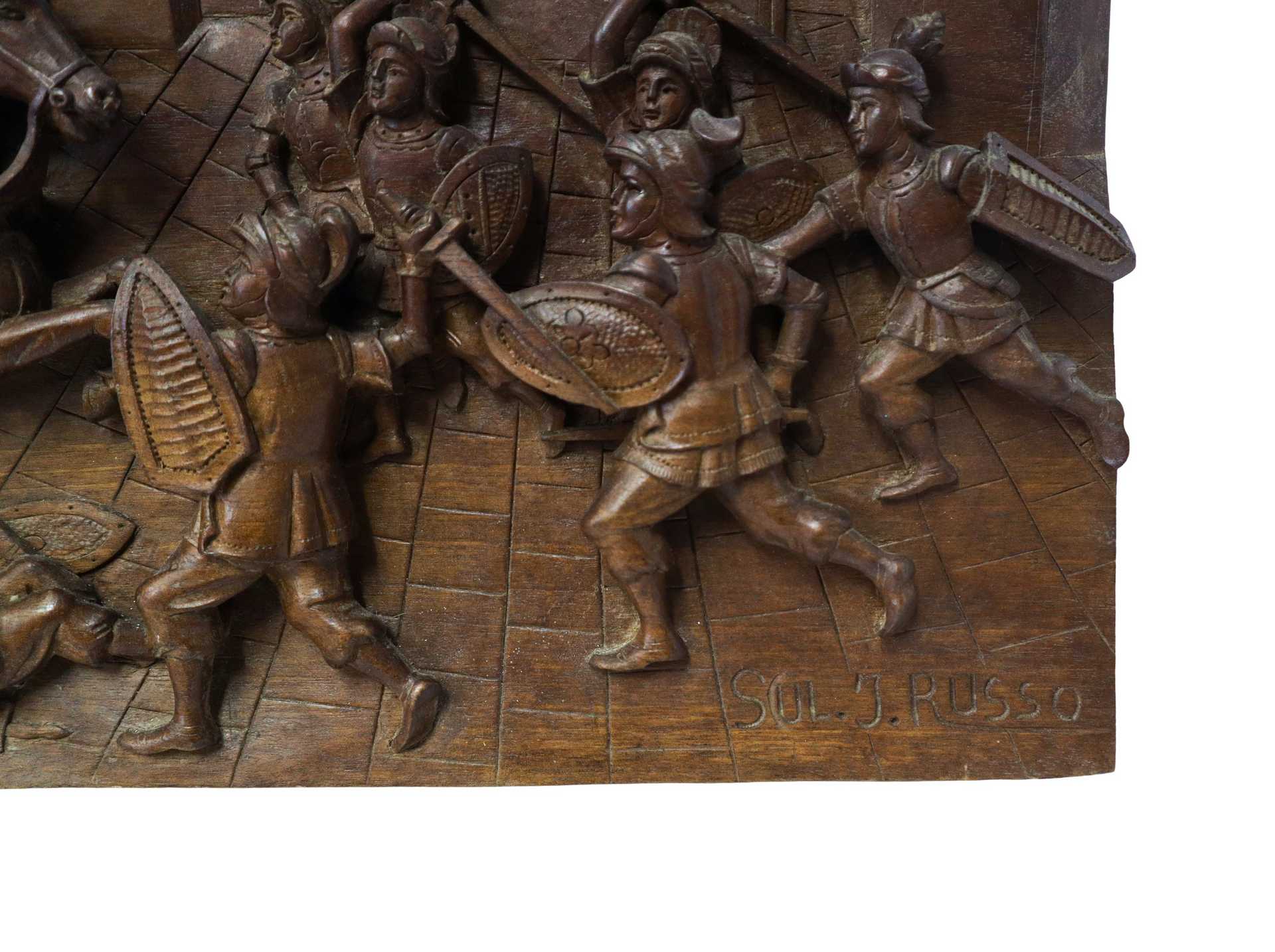 Ignazio Russo - Pannello ligneo scolpito e intagliato a rilievo e bassorilievo su legno di noce , Scena della Chanson de Roland dei paladini di Francia , First half of the 20° secolo