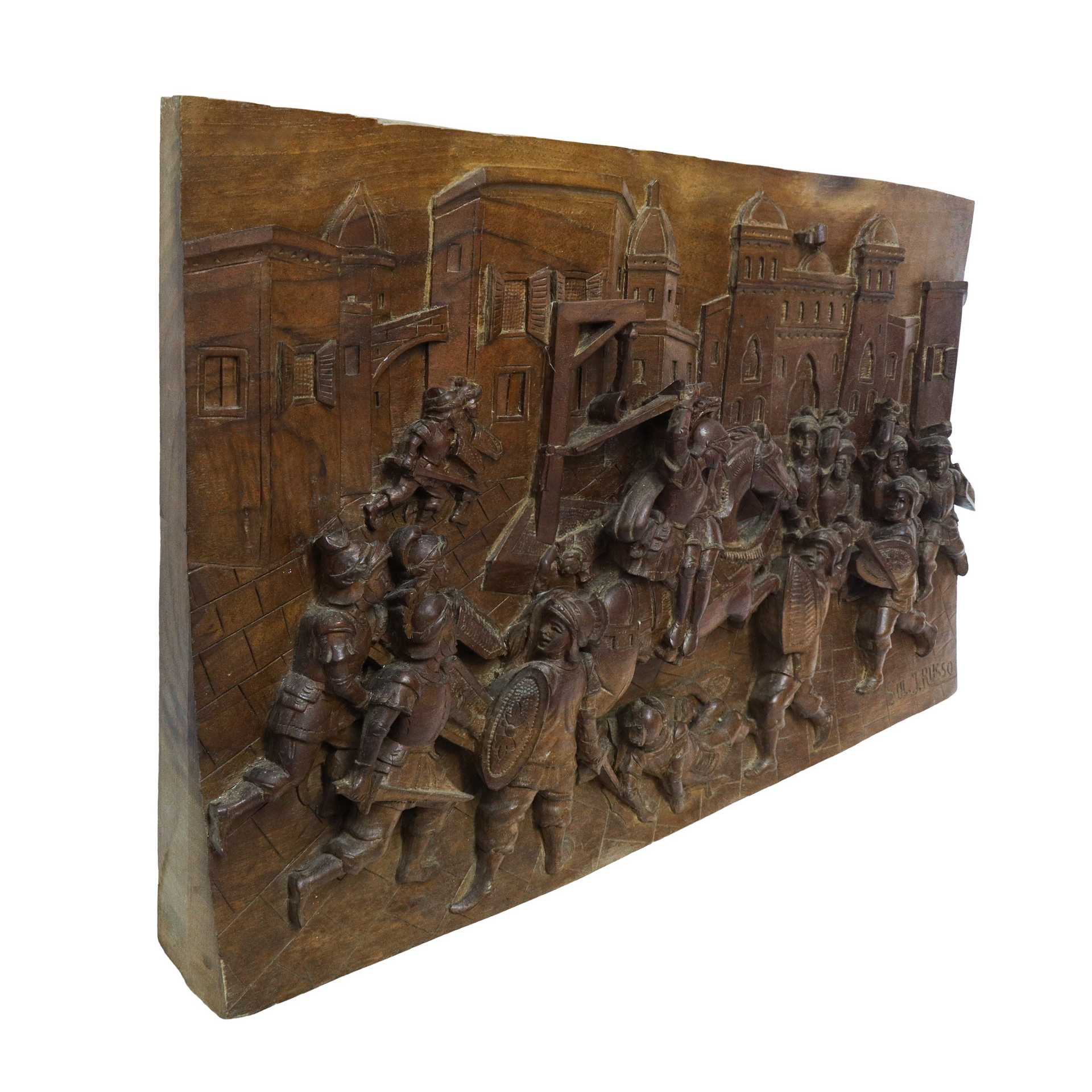 Ignazio Russo - Pannello ligneo scolpito e intagliato a rilievo e bassorilievo su legno di noce , Scena della Chanson de Roland dei paladini di Francia , First half of the 20° secolo cm 52x30 Firmati in basso a destra. Pannello realizzato secondo la tradizione sicilianaFirmati in basso a destra. Pannello realizzato secondo la tradizione siciliana