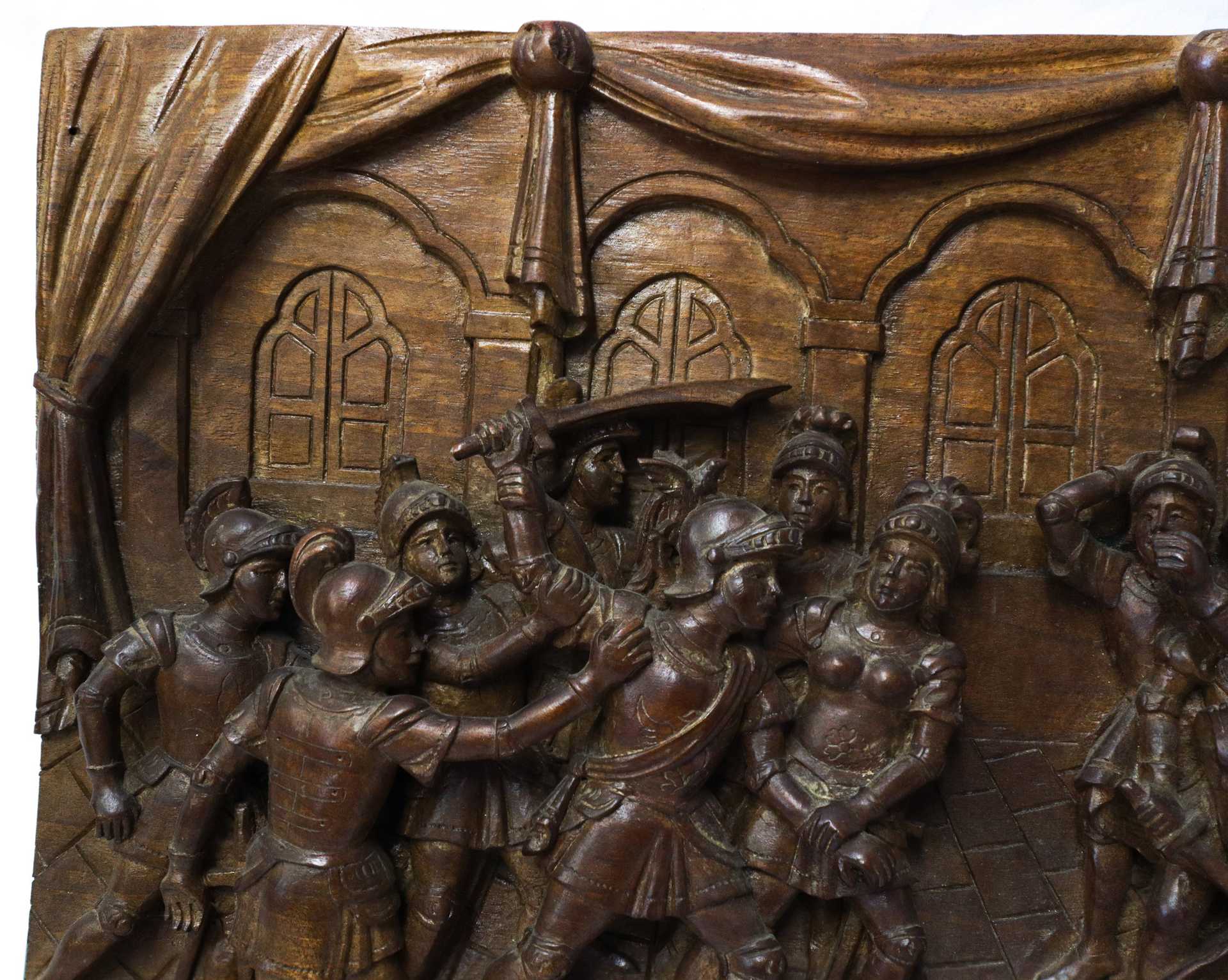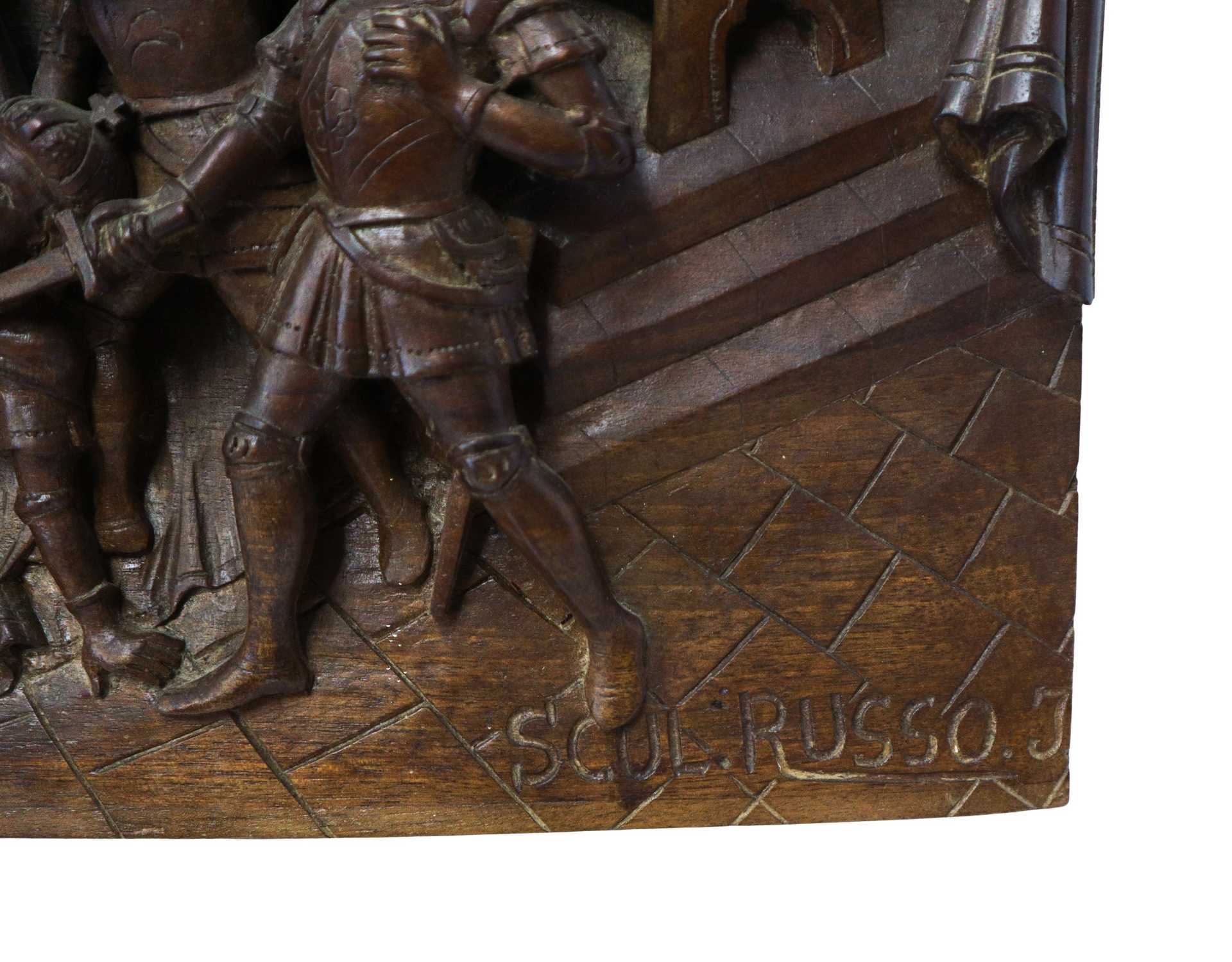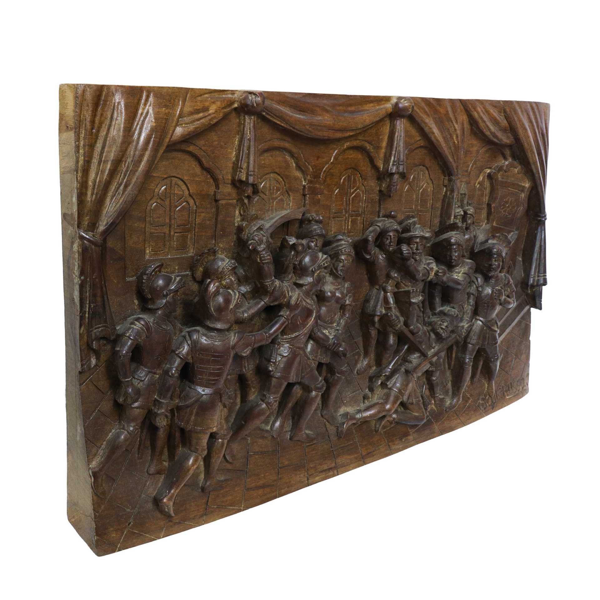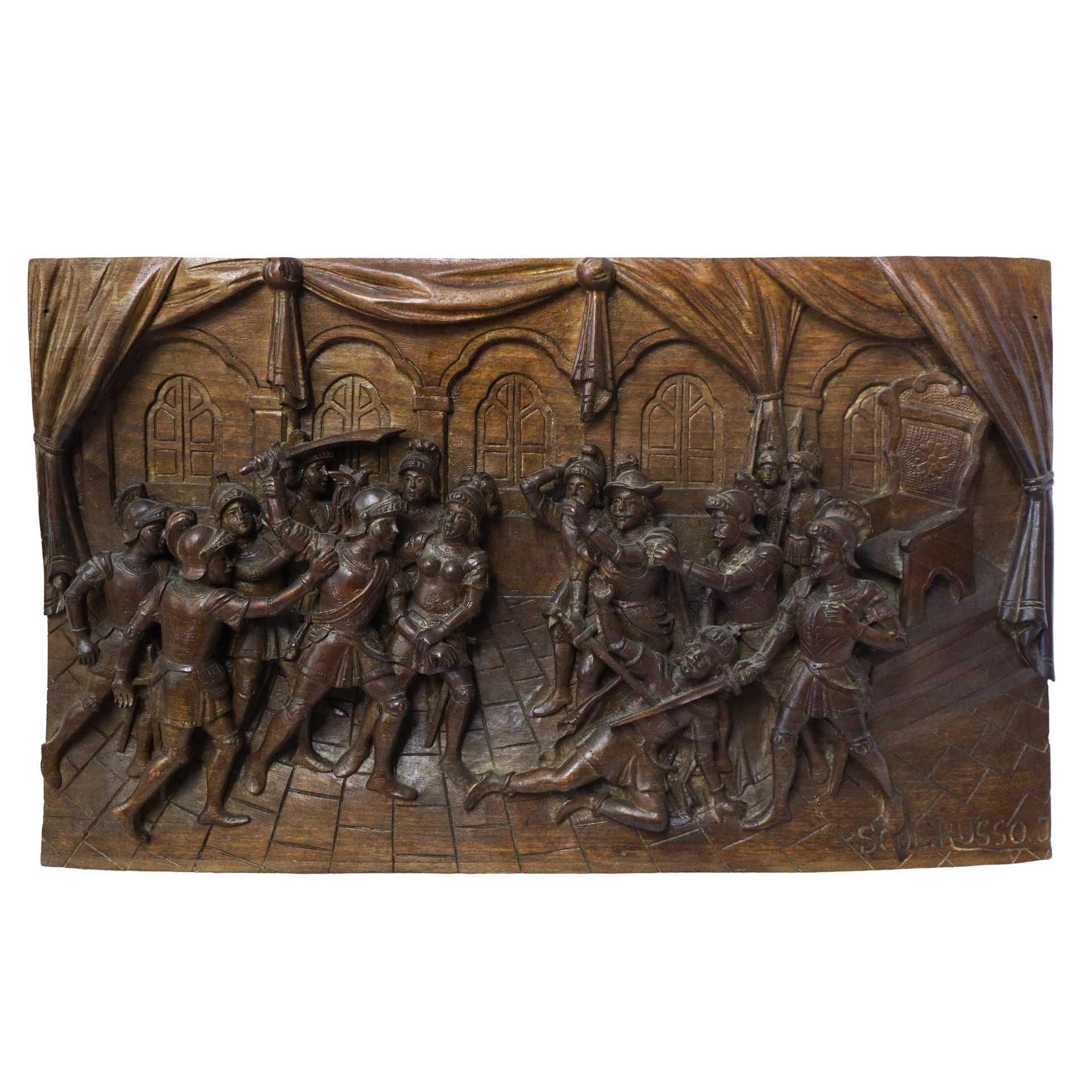 Ignazio Russo - Pannello ligneo scolpito e intagliato a rilievo e bassorilievo su legno di noce , Scena della Chanson de Roland dei paladini di Francia , First half of the 20° secolo
