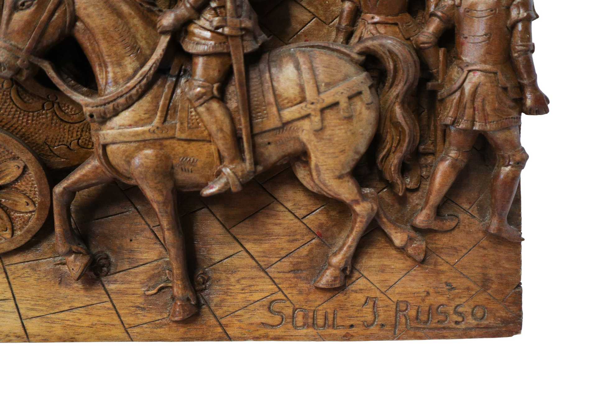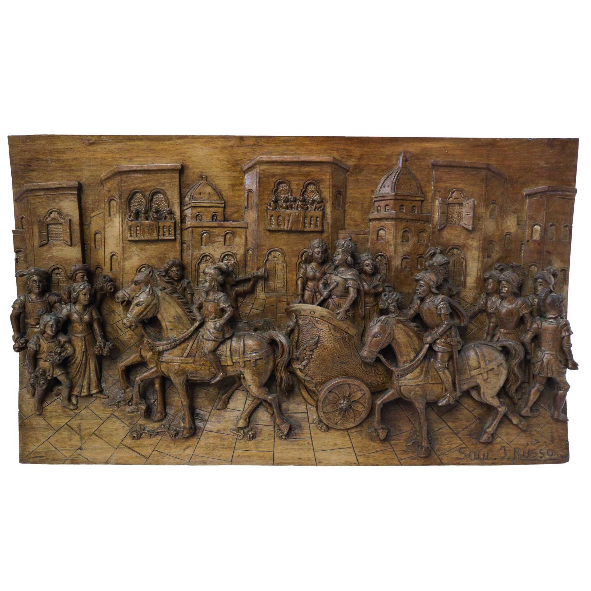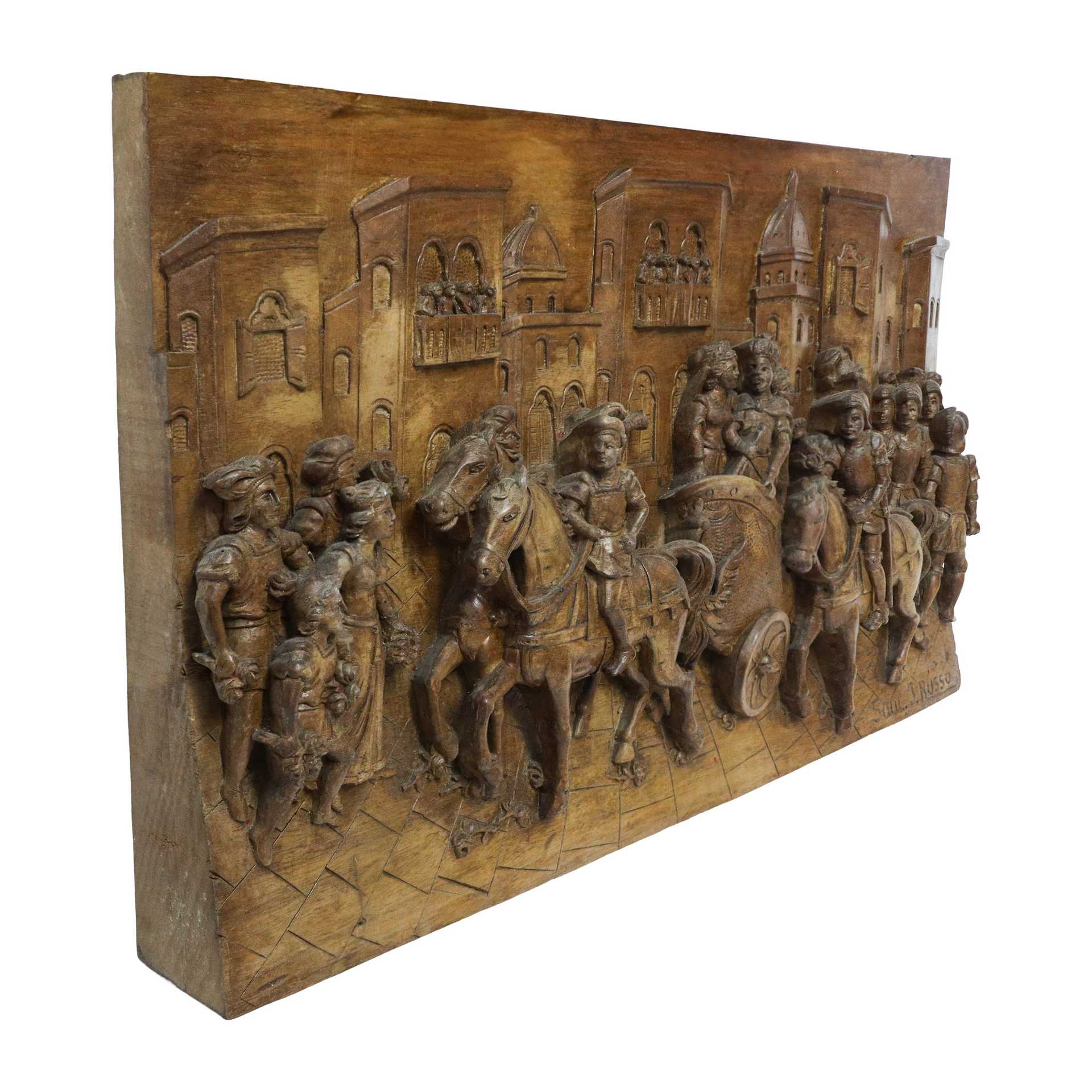Ignazio Russo - Pannello ligneo scolpito e intagliato a rilievo e bassorilievo su legno di noce , Scena della Chanson de Roland dei paladini di Francia , First half of the 20° secolo