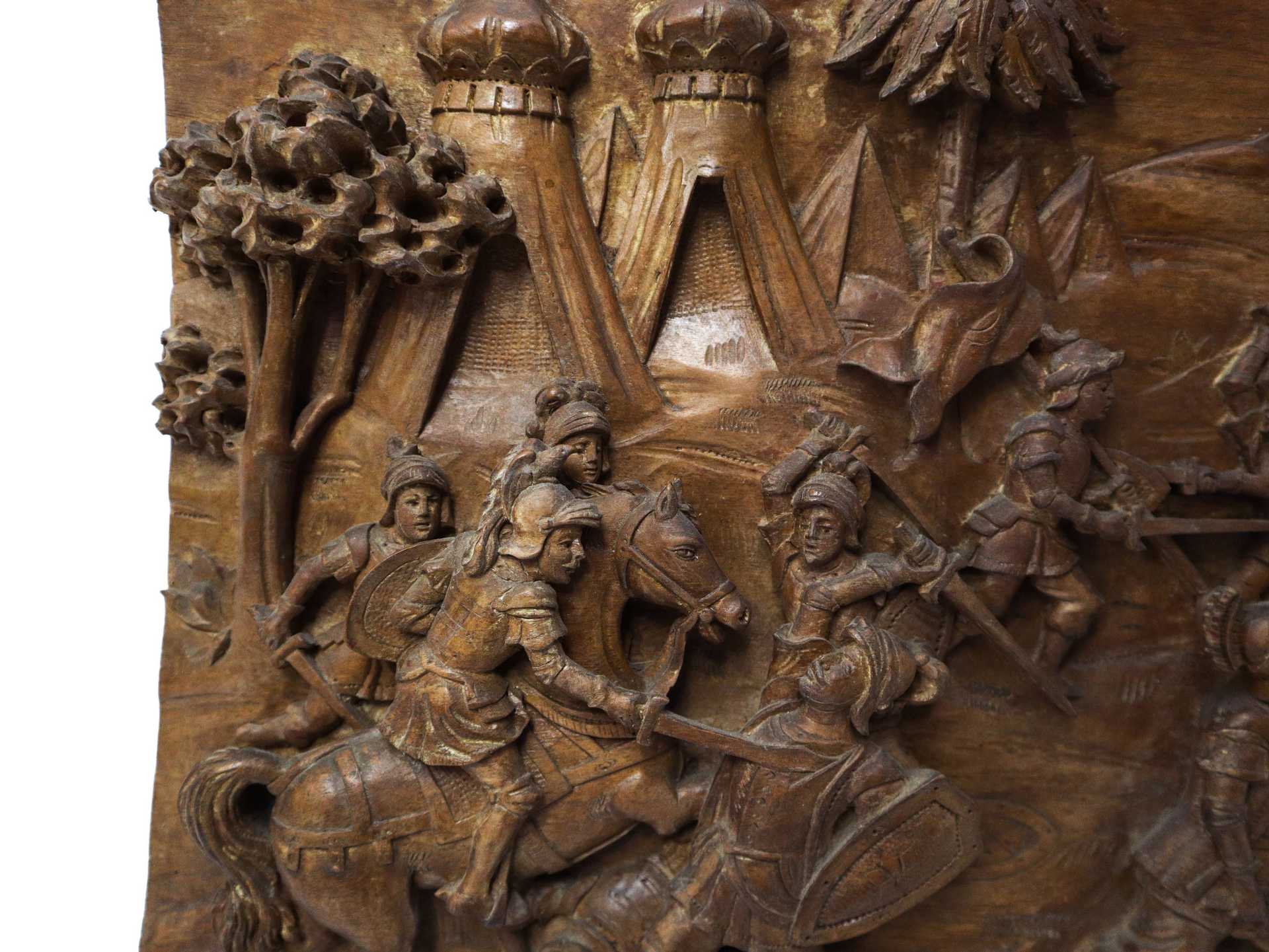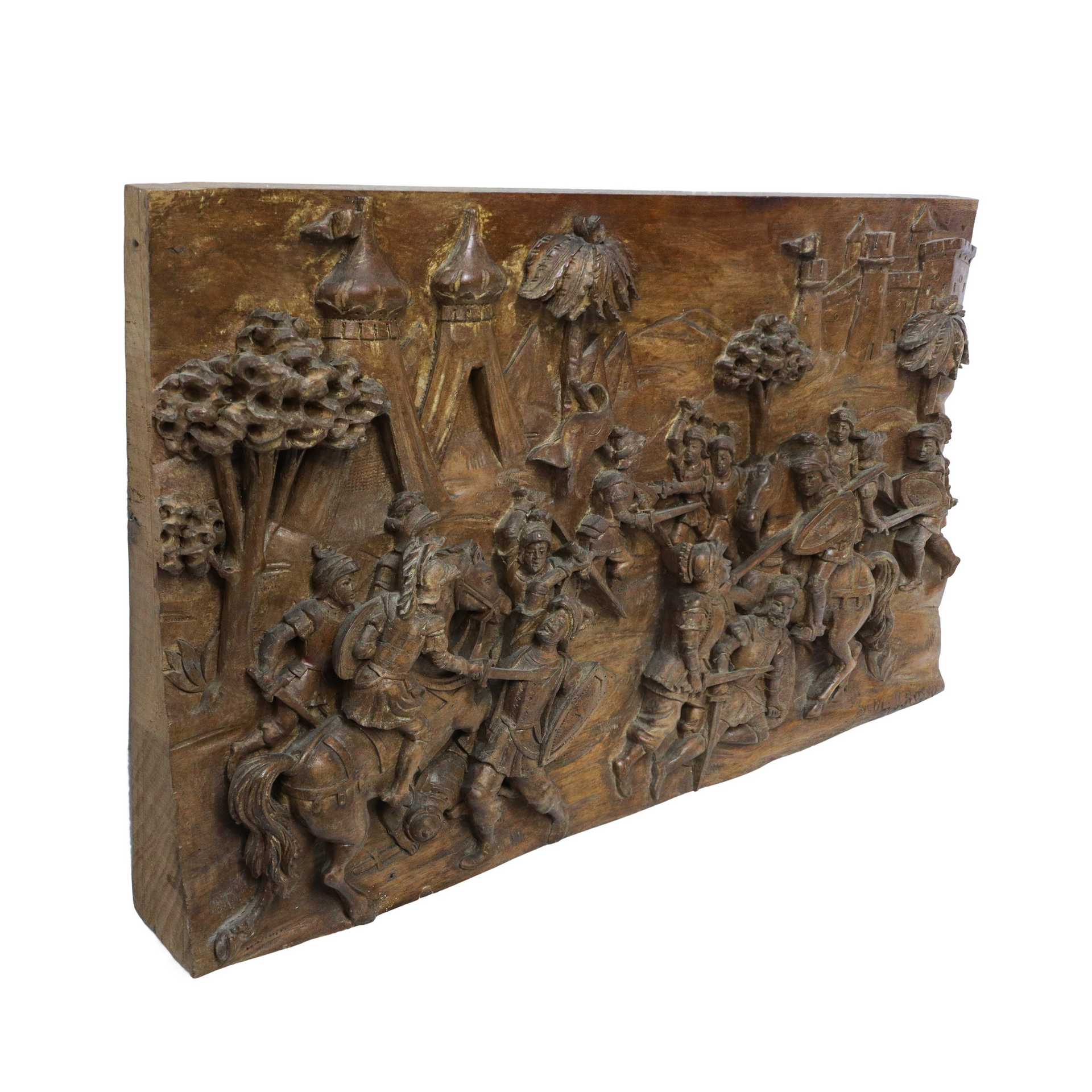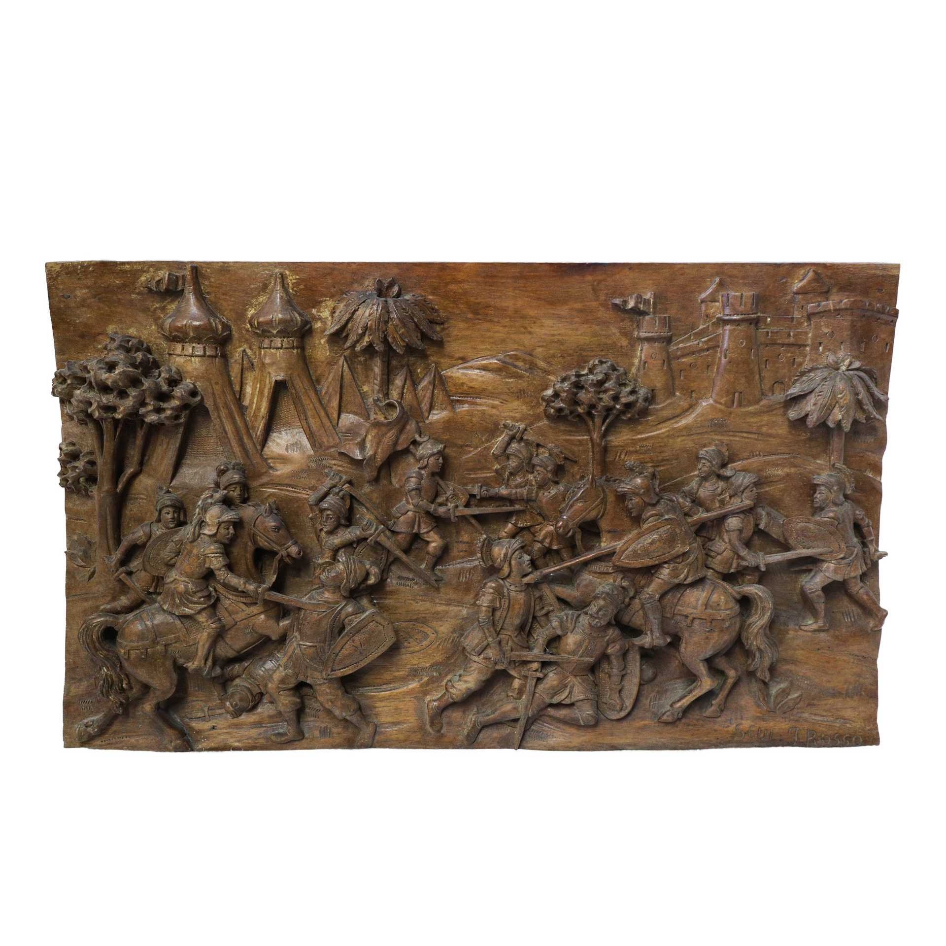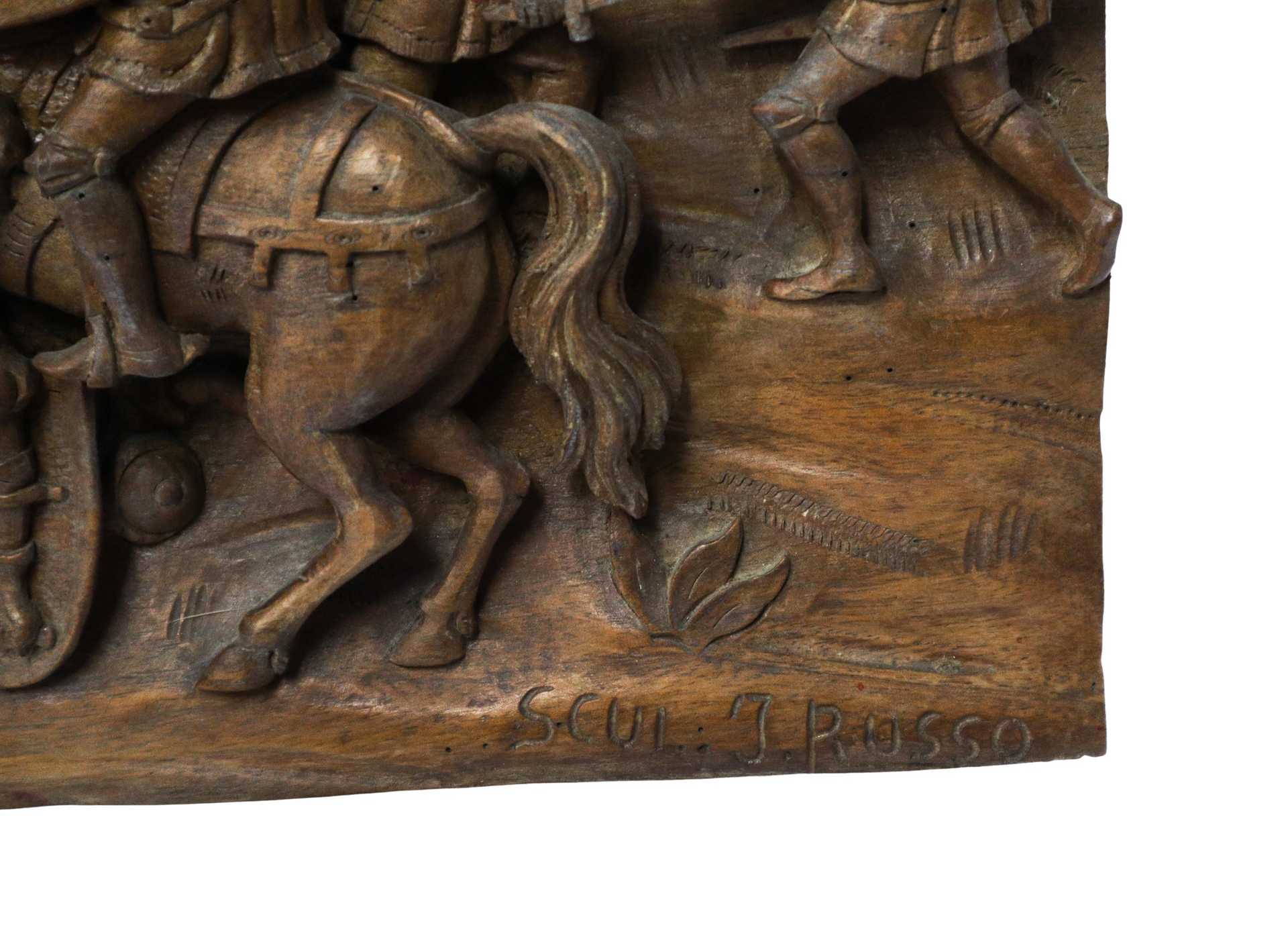 Ignazio Russo - Pannello ligneo scolpito e intagliato a rilievo e bassorilievo su legno di noce , Scena della Chanson de Roland dei paladini di Francia , First half of the 20° secolo