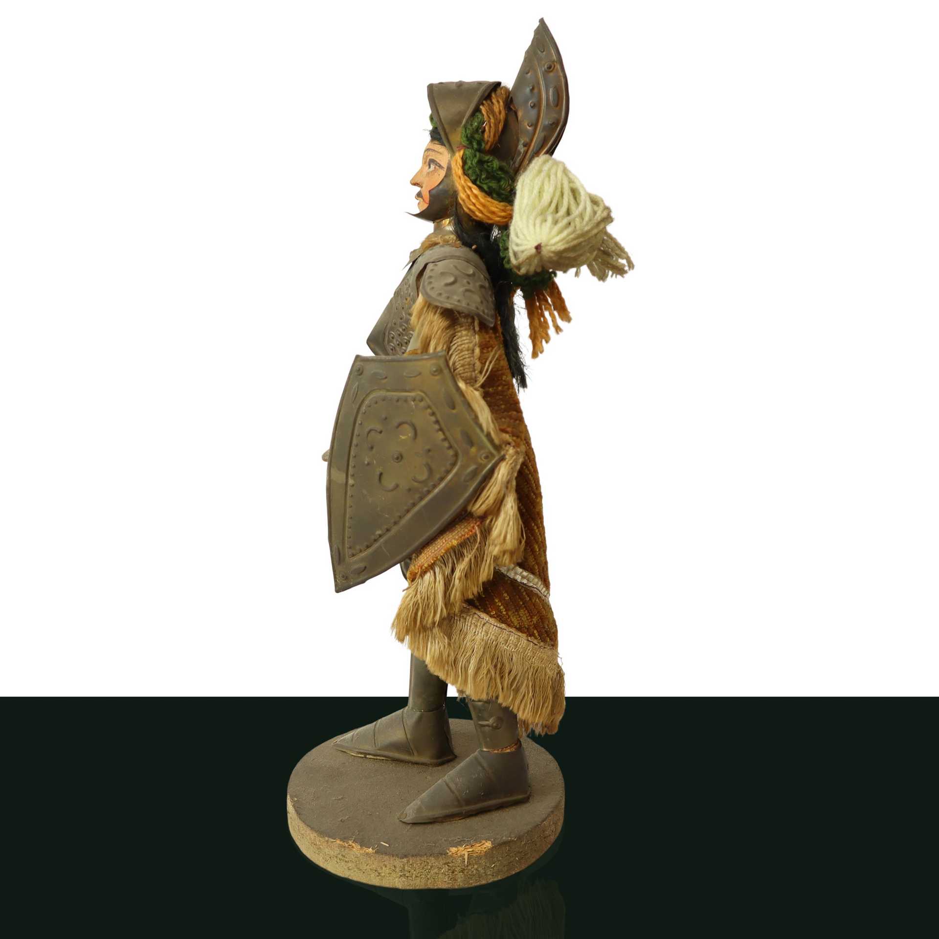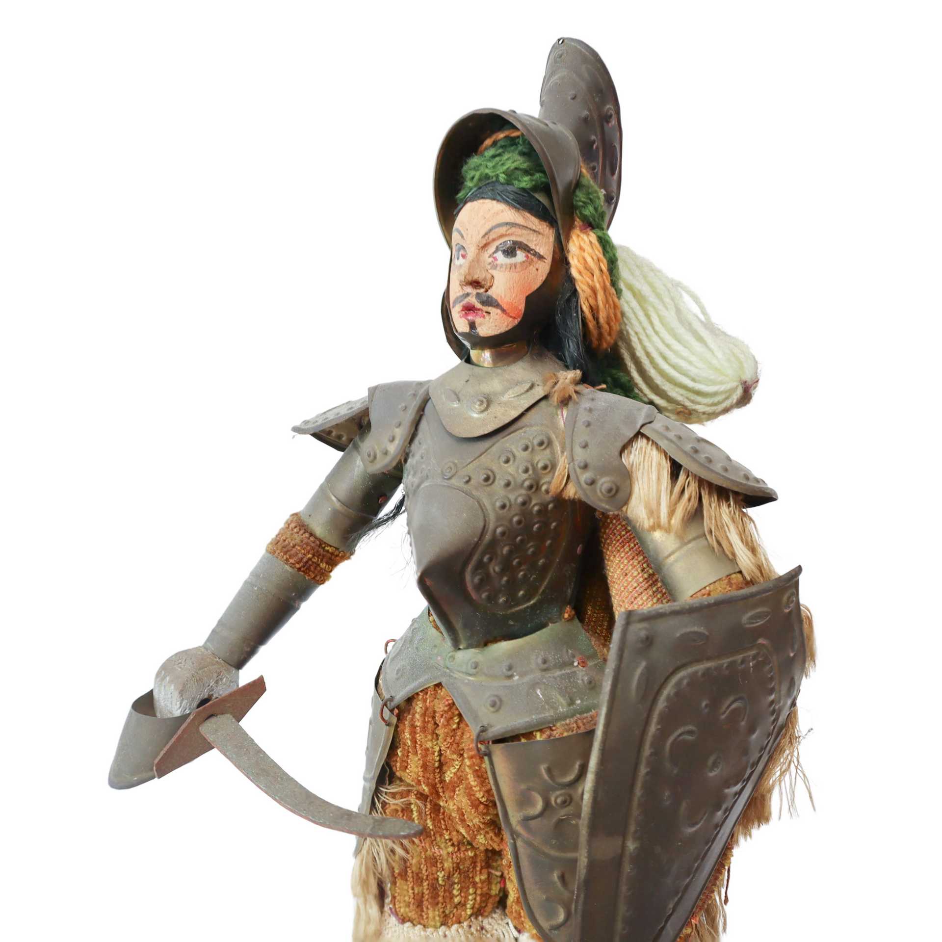 Pupo siciliano con abito in stoffa e armatura in metallo sbalzato e base in legno, Primi 20° secolo h cm 37
