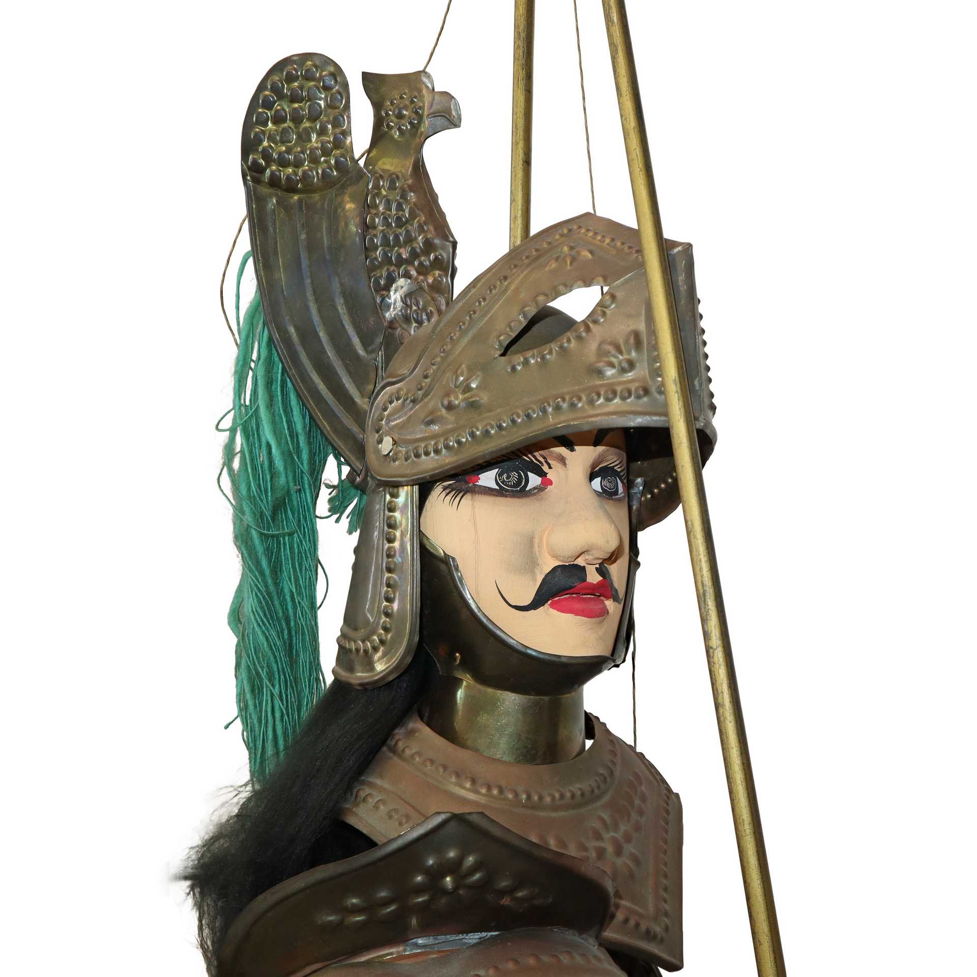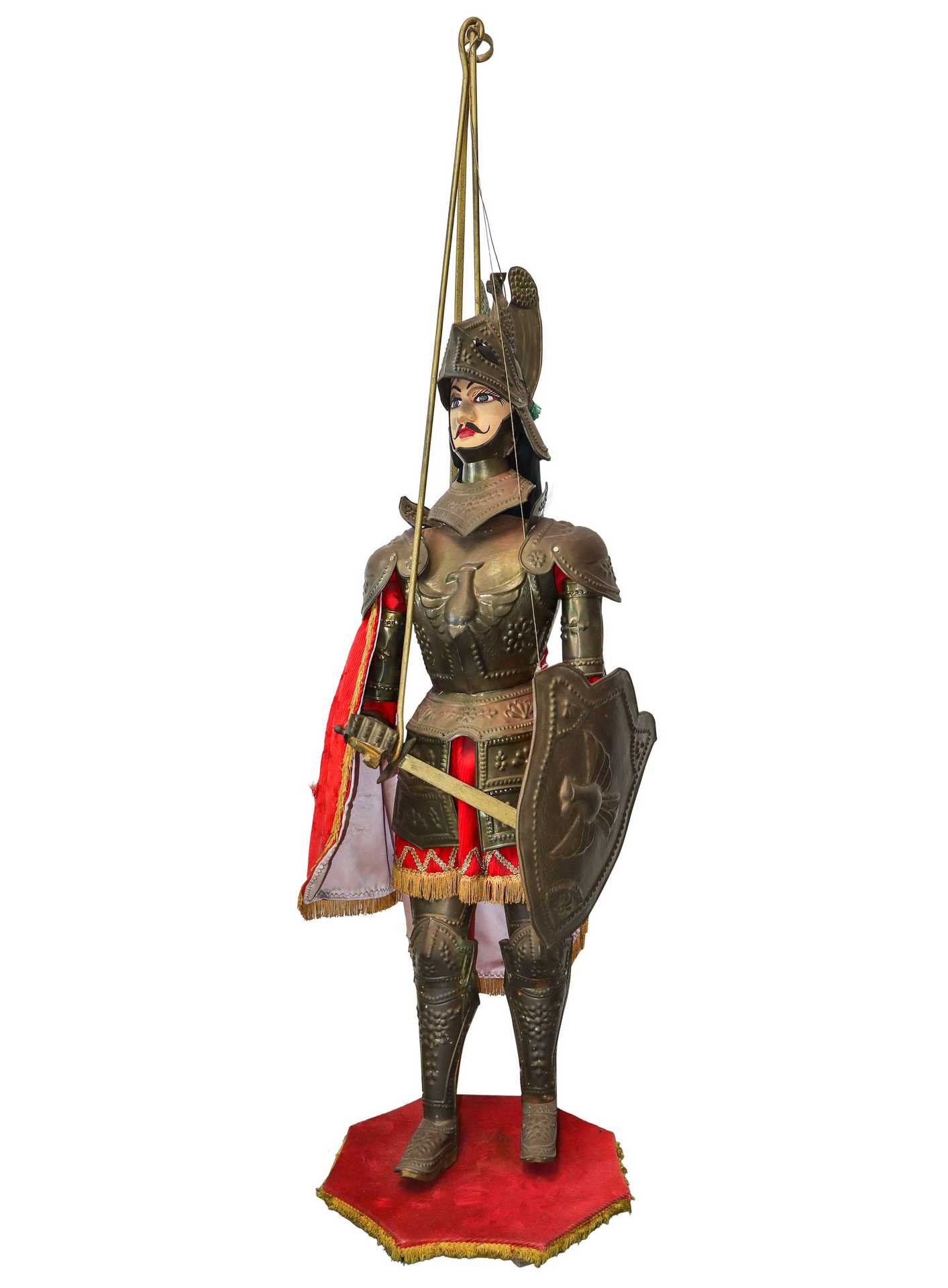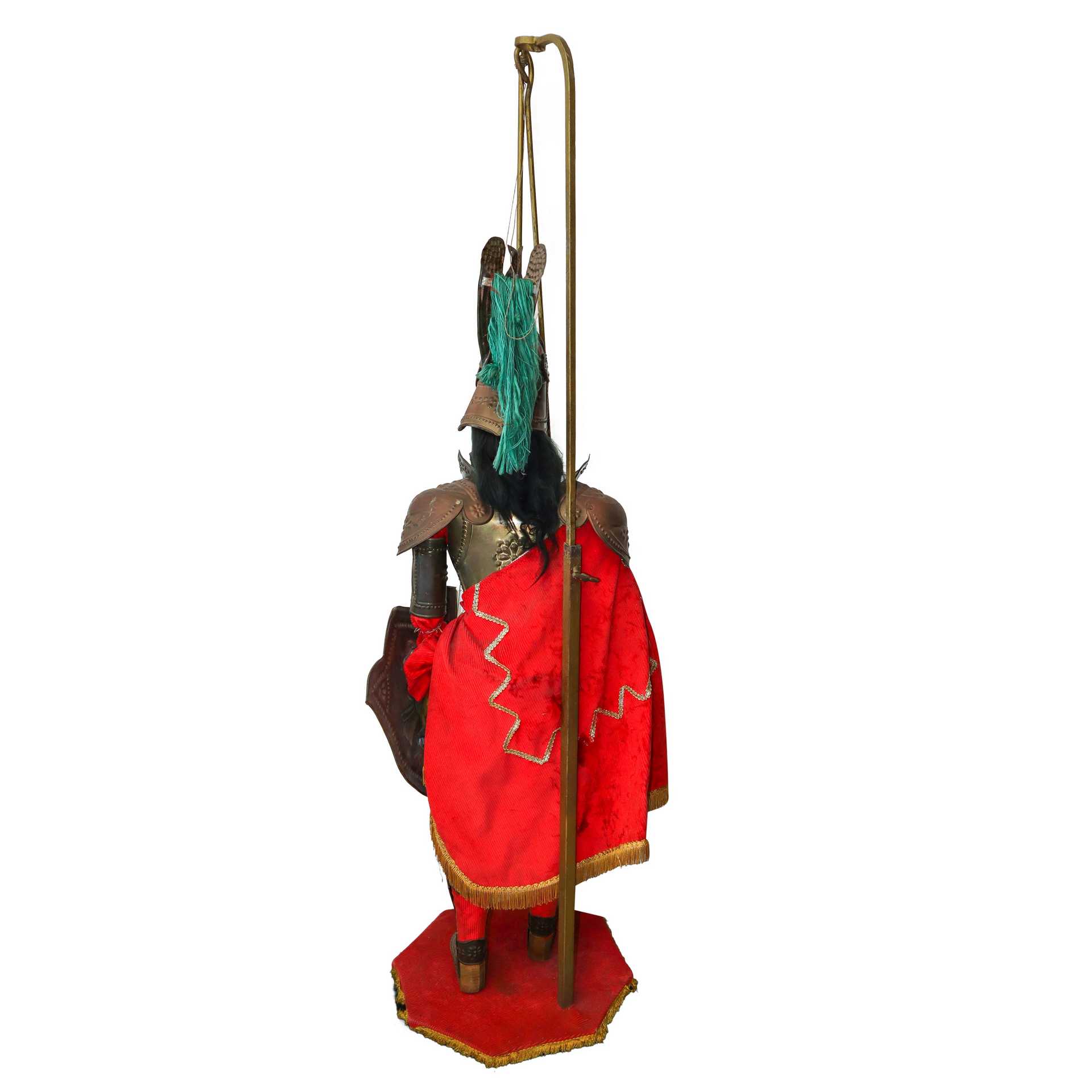 Pupo di Sicilia con armatura in metallo bronzato e vestiti e mantello rosso h cm 155 Il pupo poggia su una base ottagonale rivestita in velluto rosso Il pupo poggia su una base ottagonale rivestita in velluto rosso