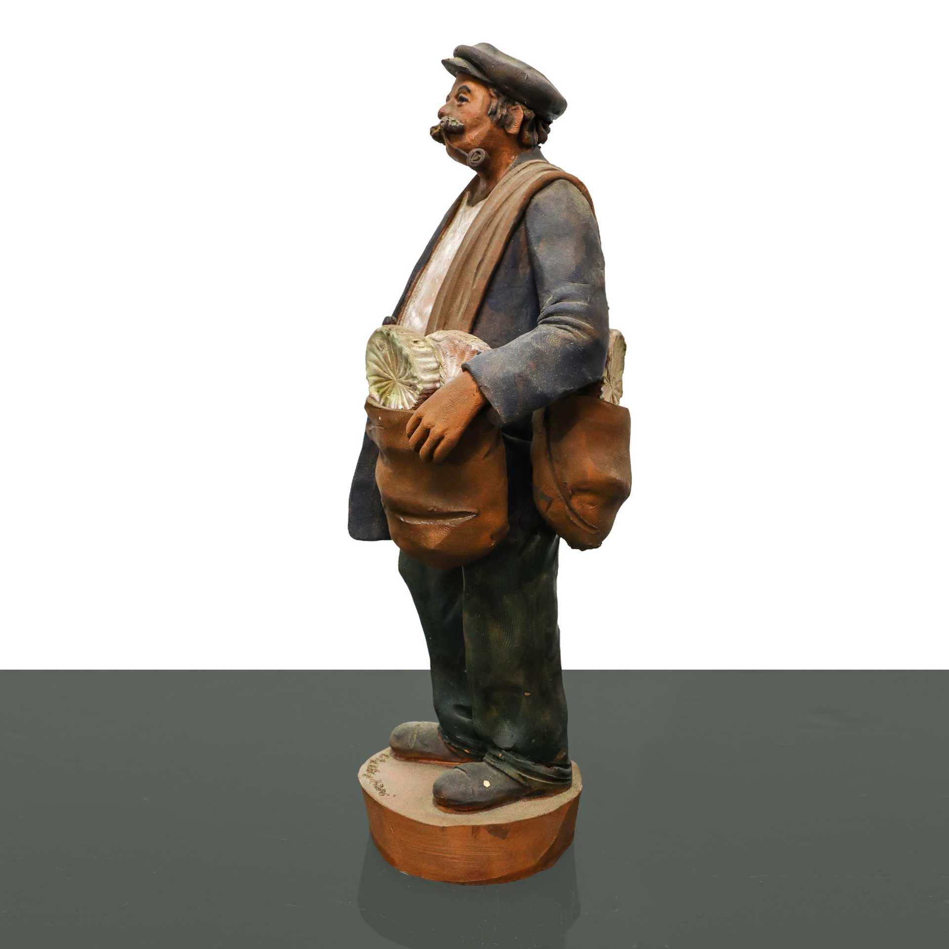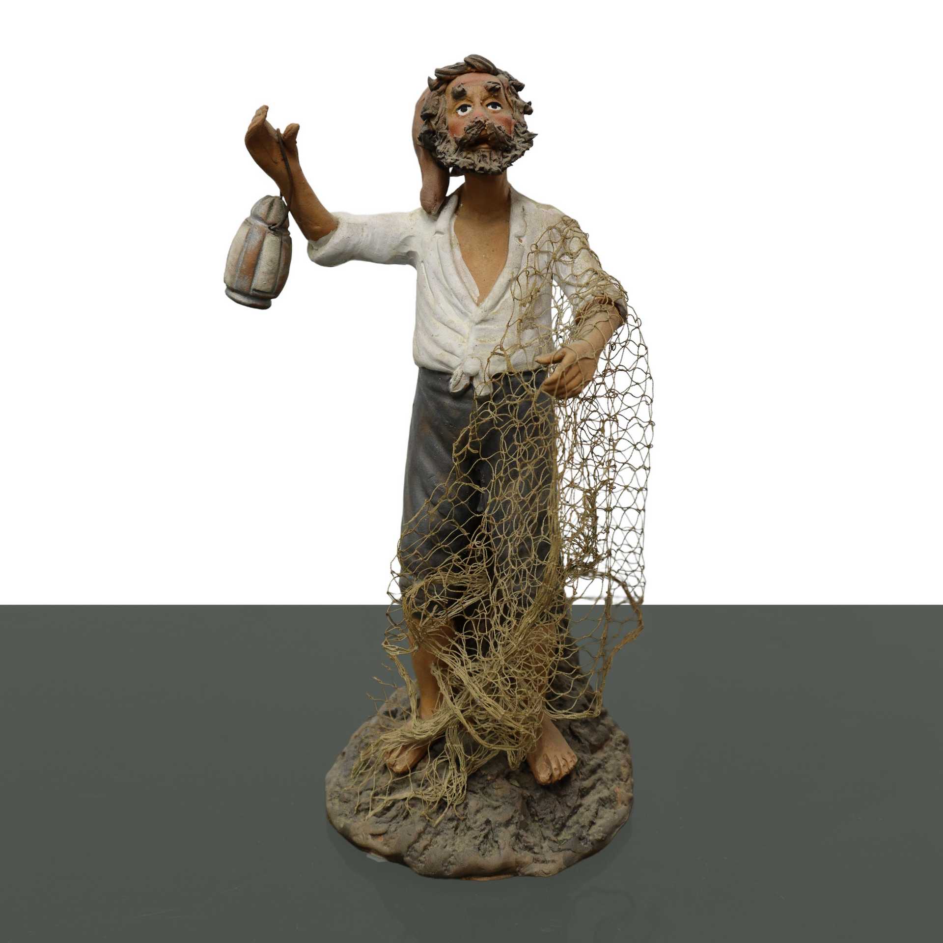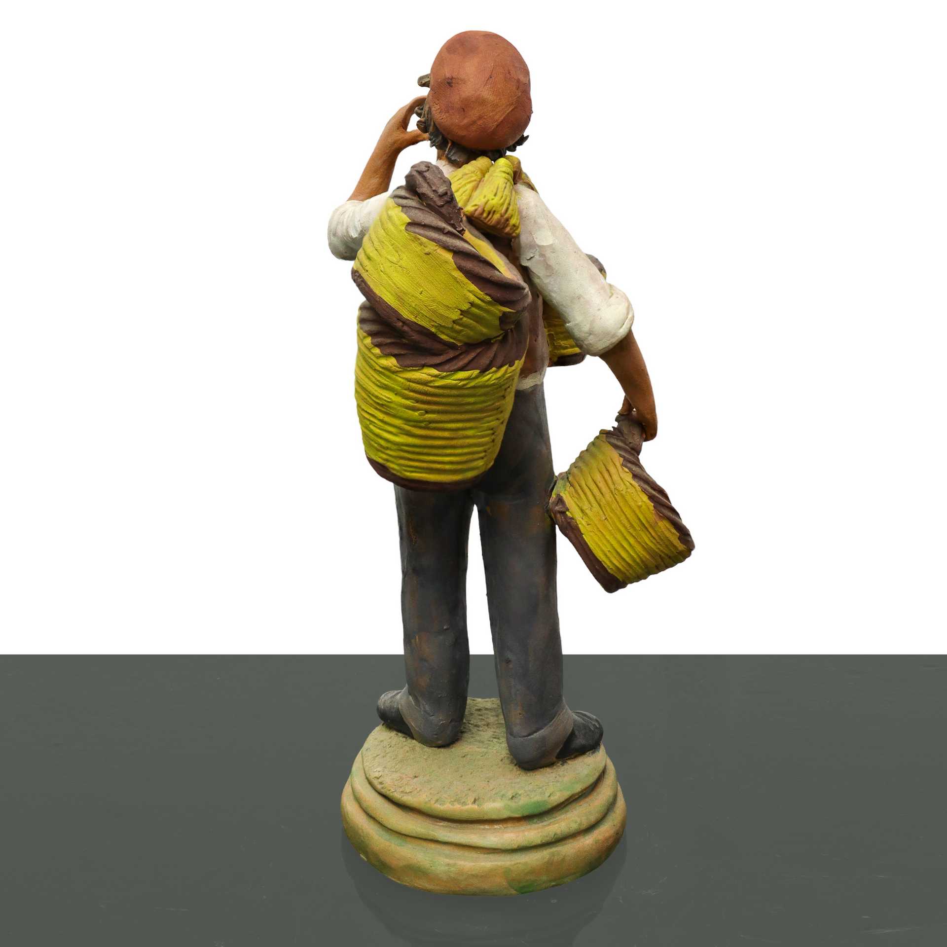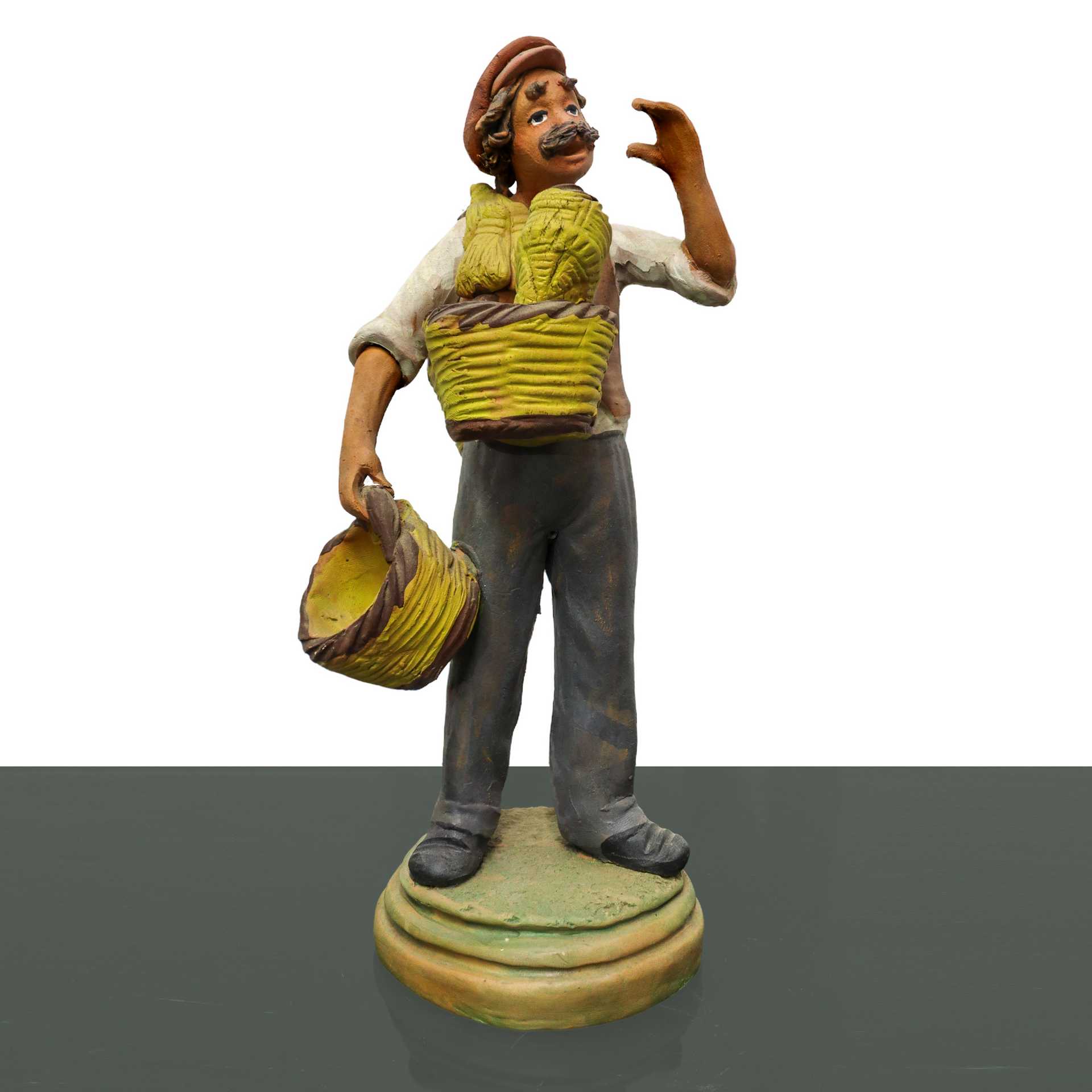 Tre statuine in terracotta di Caltagirone Uomo con formaggi, venditore di ceste, pescatore H cm 24 - ven. ceste cm 24 - pescatore cm 25