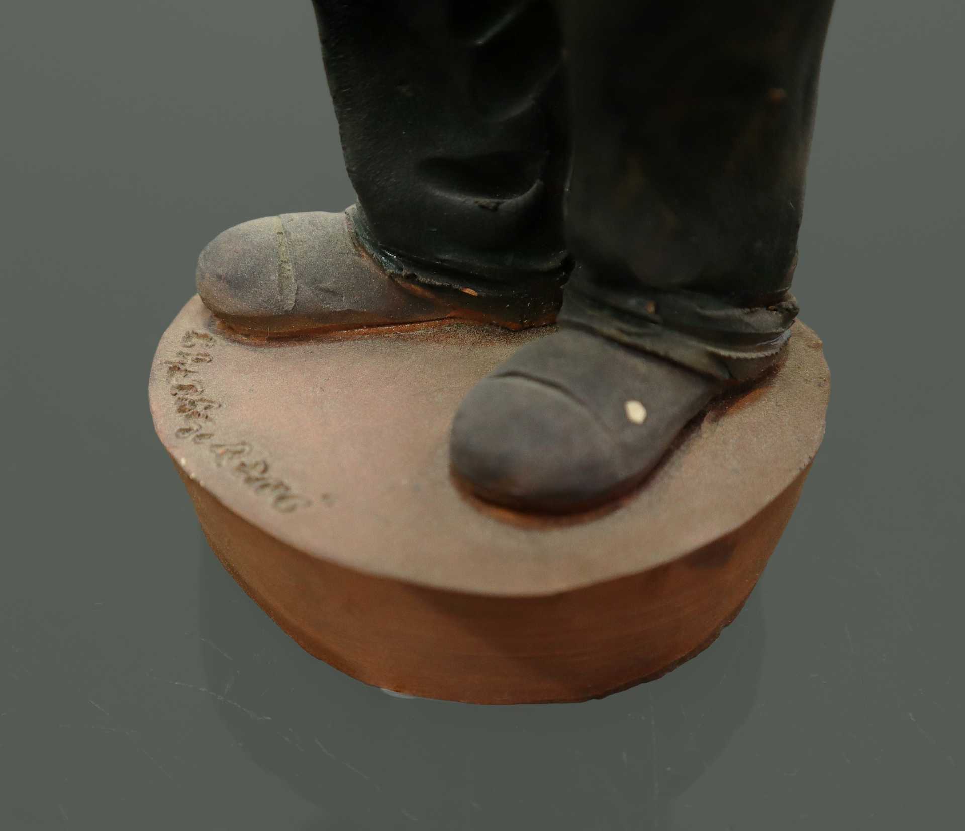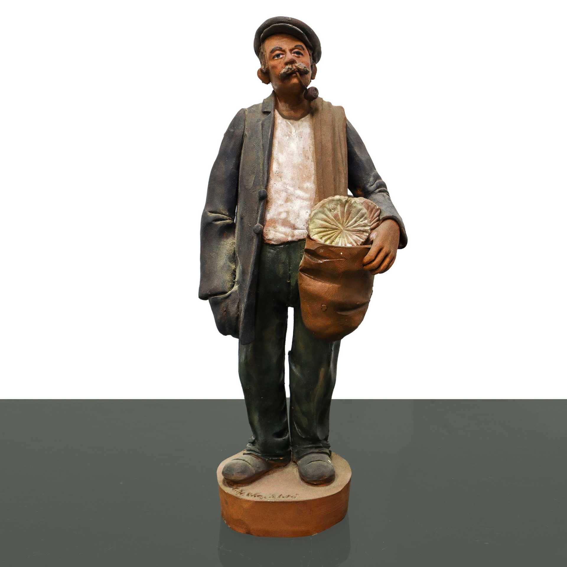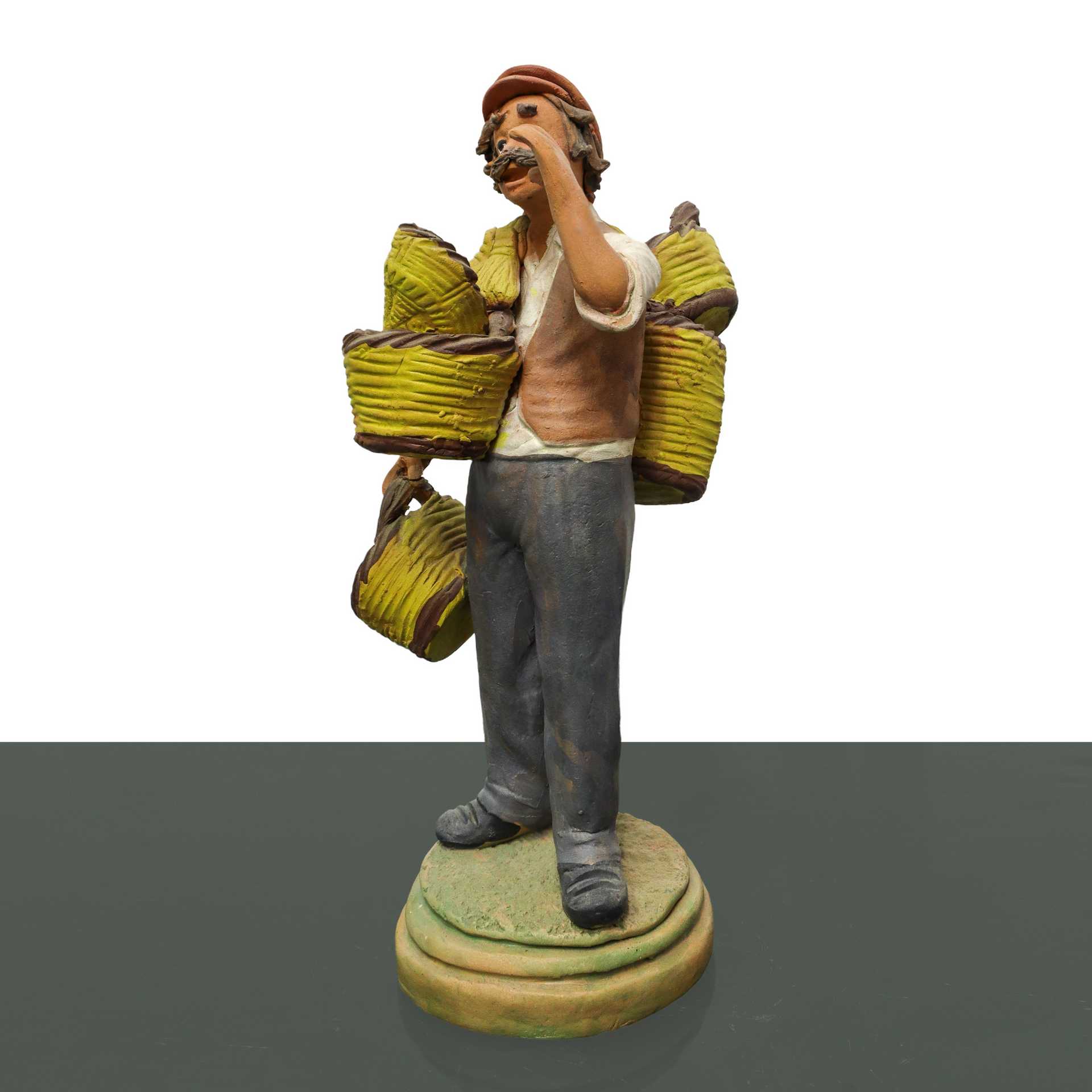 Tre statuine in terracotta di Caltagirone Uomo con formaggi, venditore di ceste, pescatore