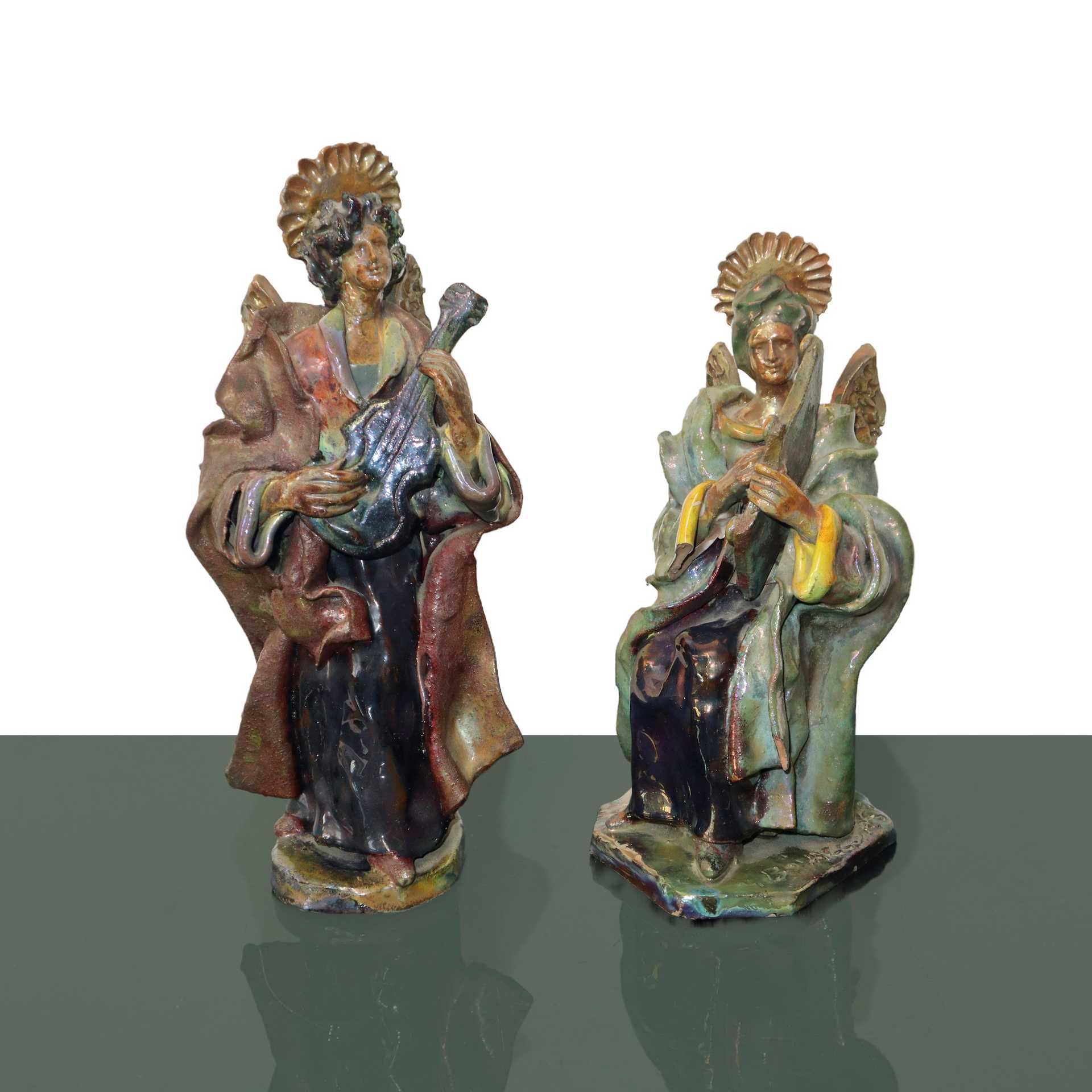 Giuseppe Bonaccorso (Caltagirone 1907 - 1993) - Coppia di angeli musicanti policromi al lustro, 1940s/1950s h cm 27, h cm 24 Firmati alla base di uno dei dueFirmati alla base di uno dei due