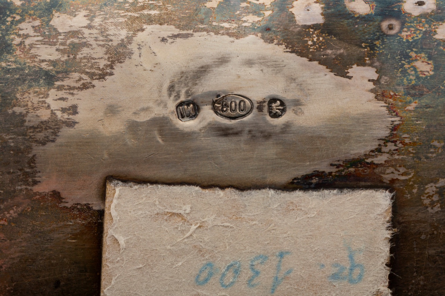 biansato con volute a ricciolo, si erge su quattro piedini fogliacei, decorato e sbalzato con frutta e festoni.