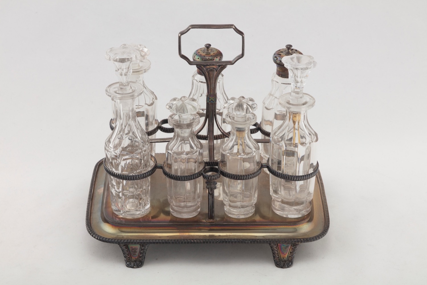 di forma rettangolare, tappi in argento con punzoni argentiere TJ, difetti (una bottiglietta in cristallo rotta).