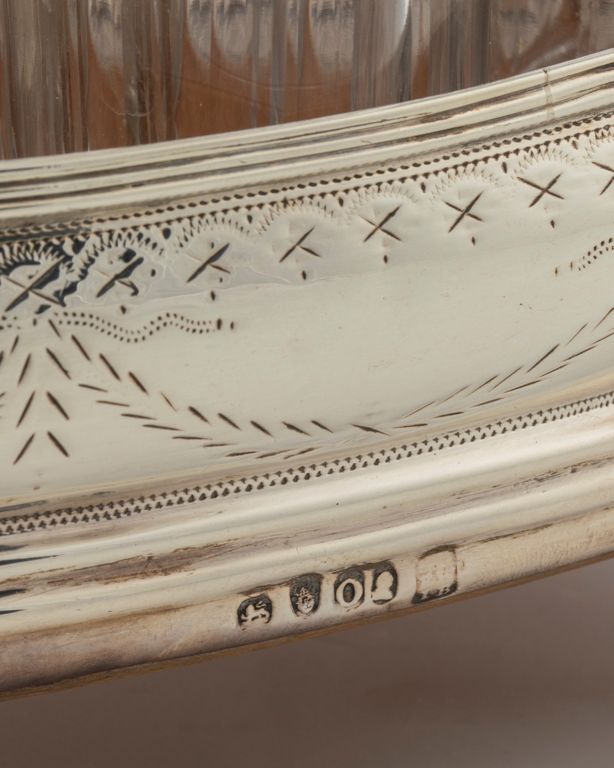 base ovale con quattro piedini scanalati, il corpo finemente inciso, presa ad anello con sei ampolle (un cucchiaino vittoriano non pertinente) (difetti).
