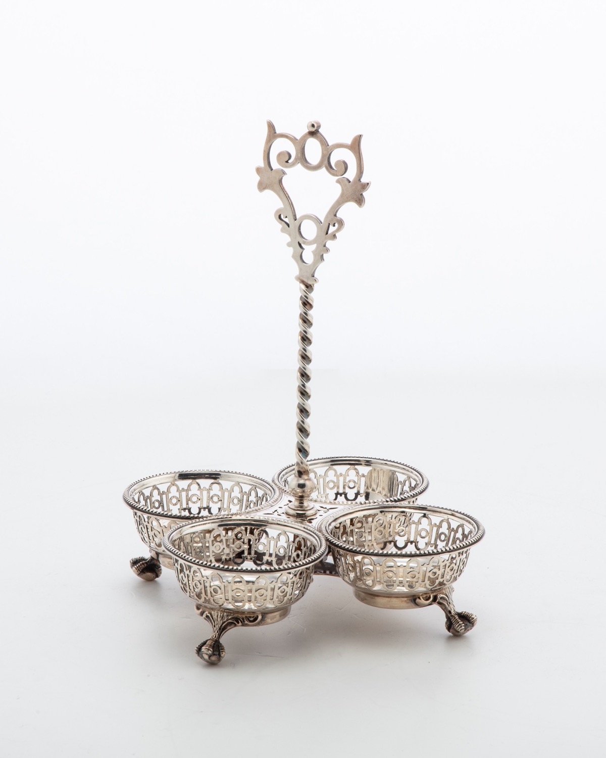 poggiante su quattro piedini ad artiglio, comprensivo di quattro ciotoline dal corpo traforato.