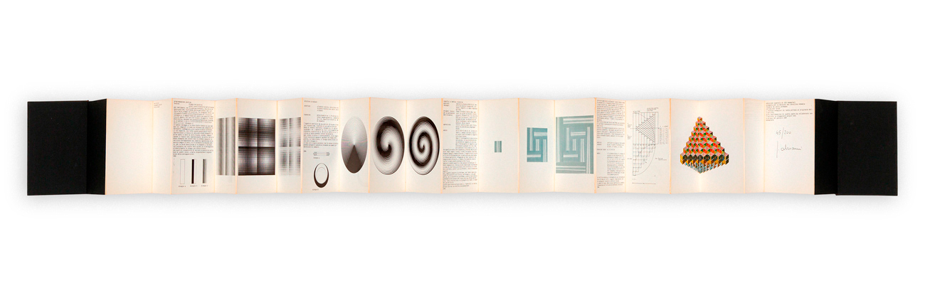 Libro d'arte a fisarmonica composto da 21 pagine con numerose riproduzioni di opere dell'Artista e illustrazioni che descrivono esperimenti tecnici sulla percezione visiva