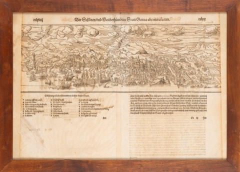 Xilografia di una delle prime vedute a volo d'uccello della città di Genova. Stampa tratta dalla Cosmographia Universalis di Sebastian Münster. Lievemente rifilata ai margini esterni. Xilografia di una delle prime vedute a volo d'uccello della città di Genova. Stampa tratta dalla Cosmographia Universalis di Sebastian Münster. Lievemente rifilata ai margini esterni.