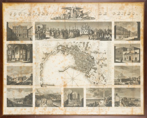 Incisa da D. Bona, particolare stampa comprendente varie vedute della città di Genova, una vasta pianta della città e in alto al centro una raffigurazione dei costumi tipici delle processioni genovesi. Diffuse fioriture e bruniture. Incisa da D. Bona, particolare stampa comprendente varie vedute della città di Genova, una vasta pianta della città e in alto al centro una raffigurazione dei costumi tipici delle processioni genovesi. Diffuse fioriture e bruniture.