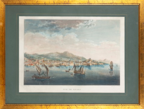 Stampa della veduta di Genova ritratta dal mare. Il primo piano è animato dalla presenza di alcuni vascelli tra i quali uno battente bandiera inglese. Buon esemplare di questa rara veduta stampata e rifinita a mano all'acquerello all'epoca.