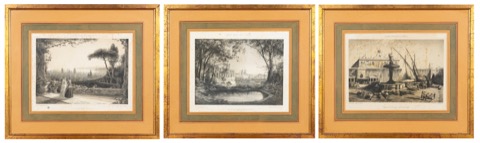 Insieme di tre stampe raffiguranti Genova dal giardino Durazzo, dalla villetta Di Negro e palazzo San Giorgio. Insieme di tre stampe raffiguranti Genova dal giardino Durazzo, dalla villetta Di Negro e palazzo San Giorgio.