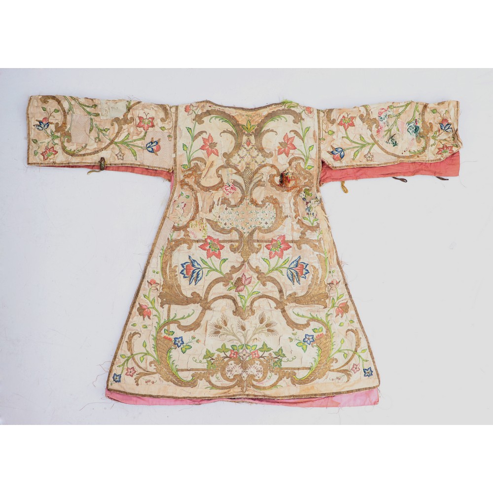 Pianeta in tessuto di seta con ricami a mano (usure).