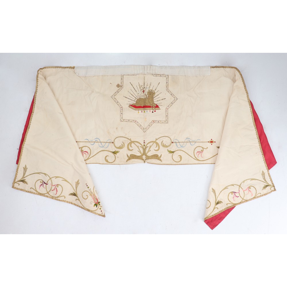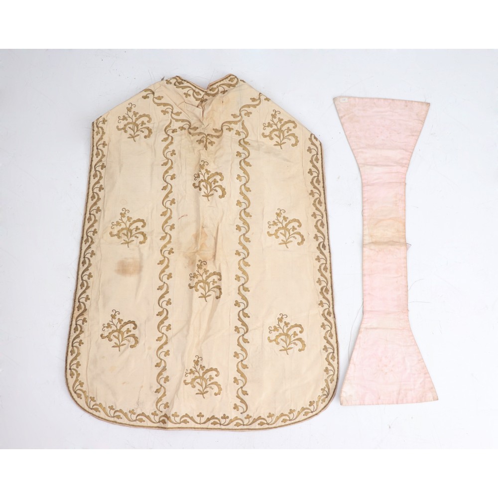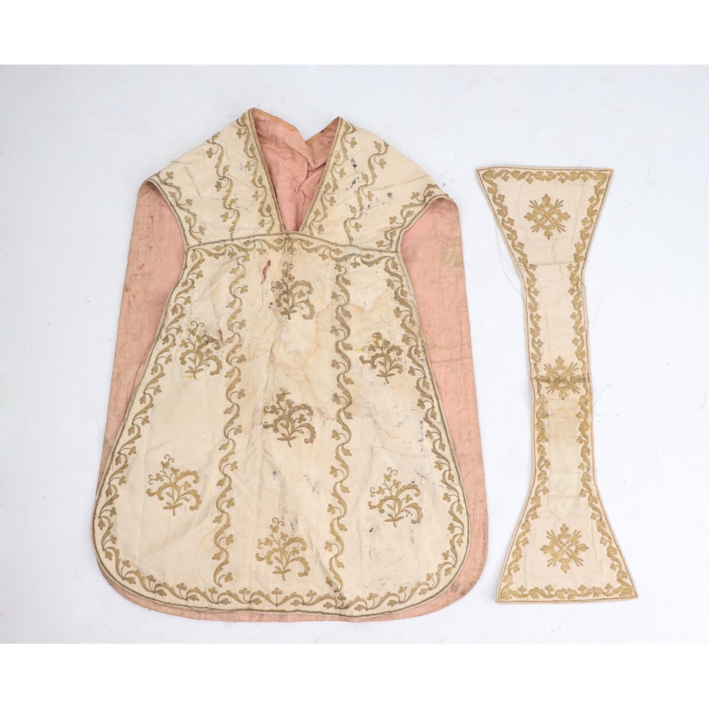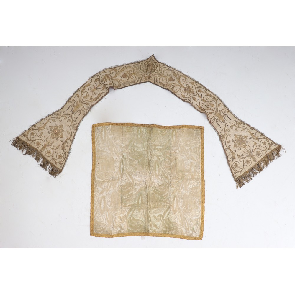 Pianeta, copri altare e due stole in tessuto di seta con ricami a mano (usure).