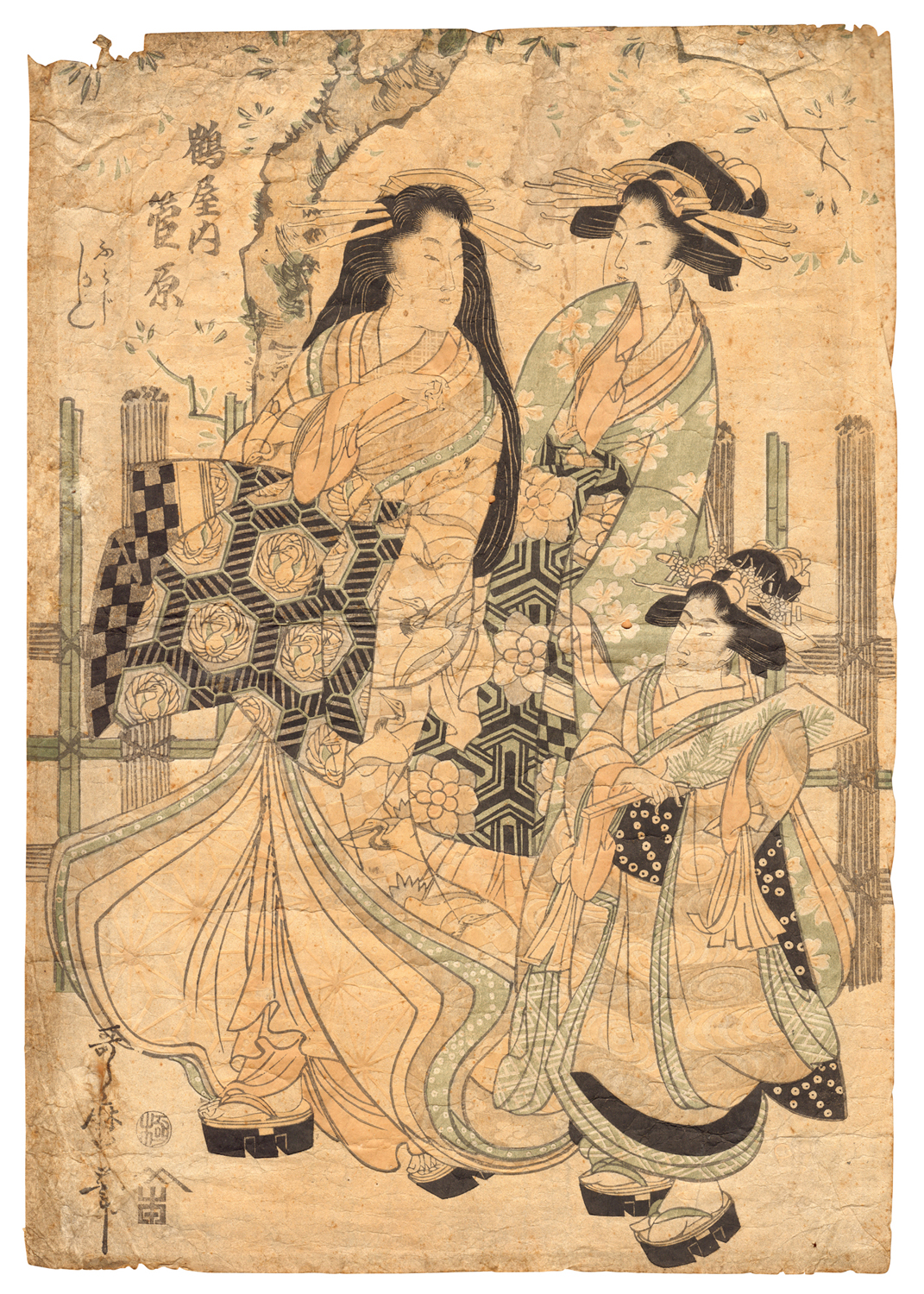 La stampa ritrae la cortigiana Shinohara di Tsuruya, finemente abbigliata, seguita da due giovani attendenti. Per sottolineare la ricchezza delle vesti, l'artista sovrappone un doppio livello di decorazione, il primo affidato al disegno ed al colore ed il secondo alla goffratura, ossia alla impronta dei motivi ornamentali nella carta.