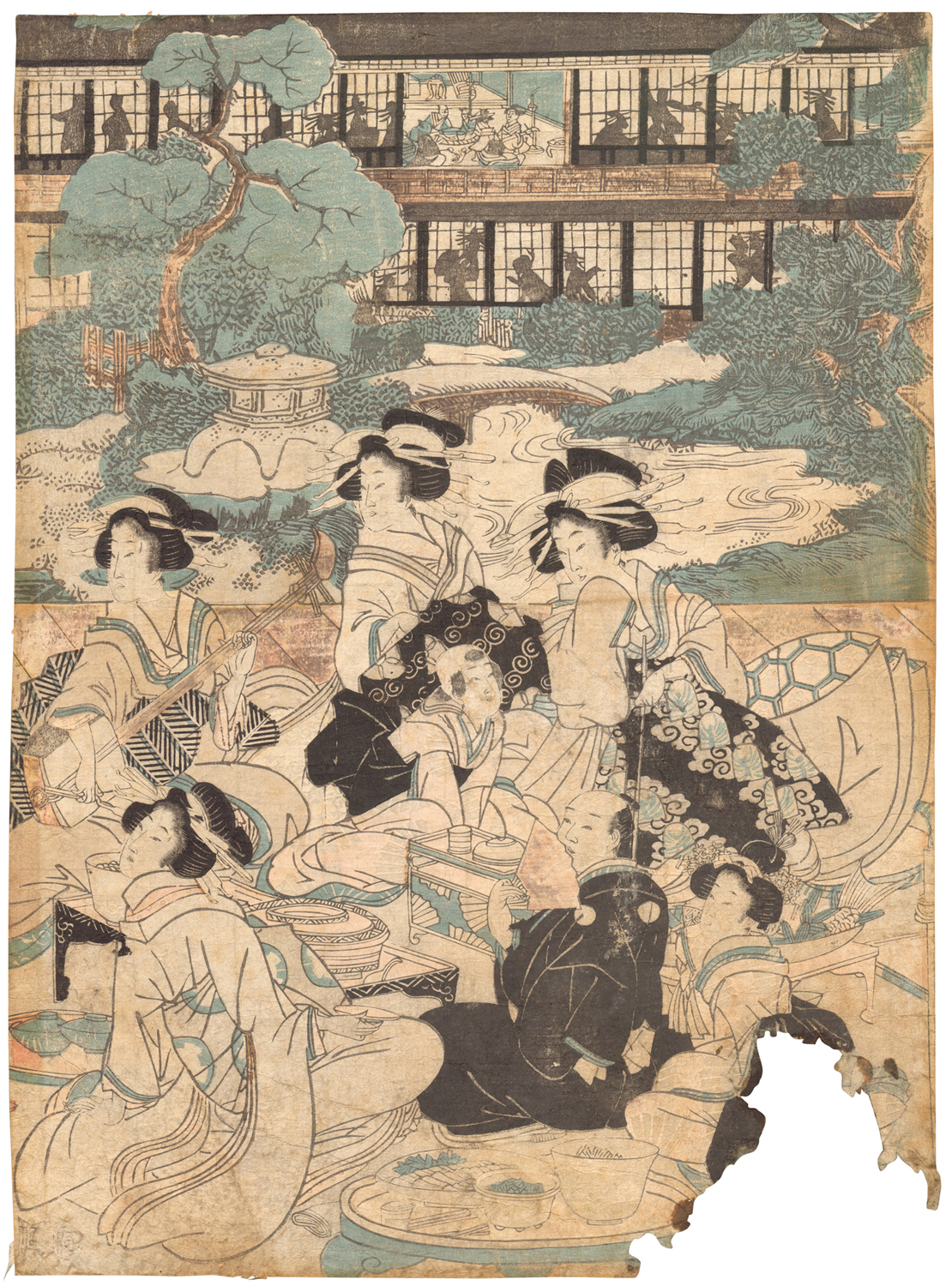 La stampa, probabilmente ispirata a un'incisione di Utagawa Kunisada, raffigura un banchetto, allestito nei giardini della Casa del tè: le cortigiane accolgono un samurai, mentre una geisha intrattiene gli astanti suonando uno shamisen. Lo stile - si osservino per esempio le bocche e le mani - è però distante da quello di Kunisada.