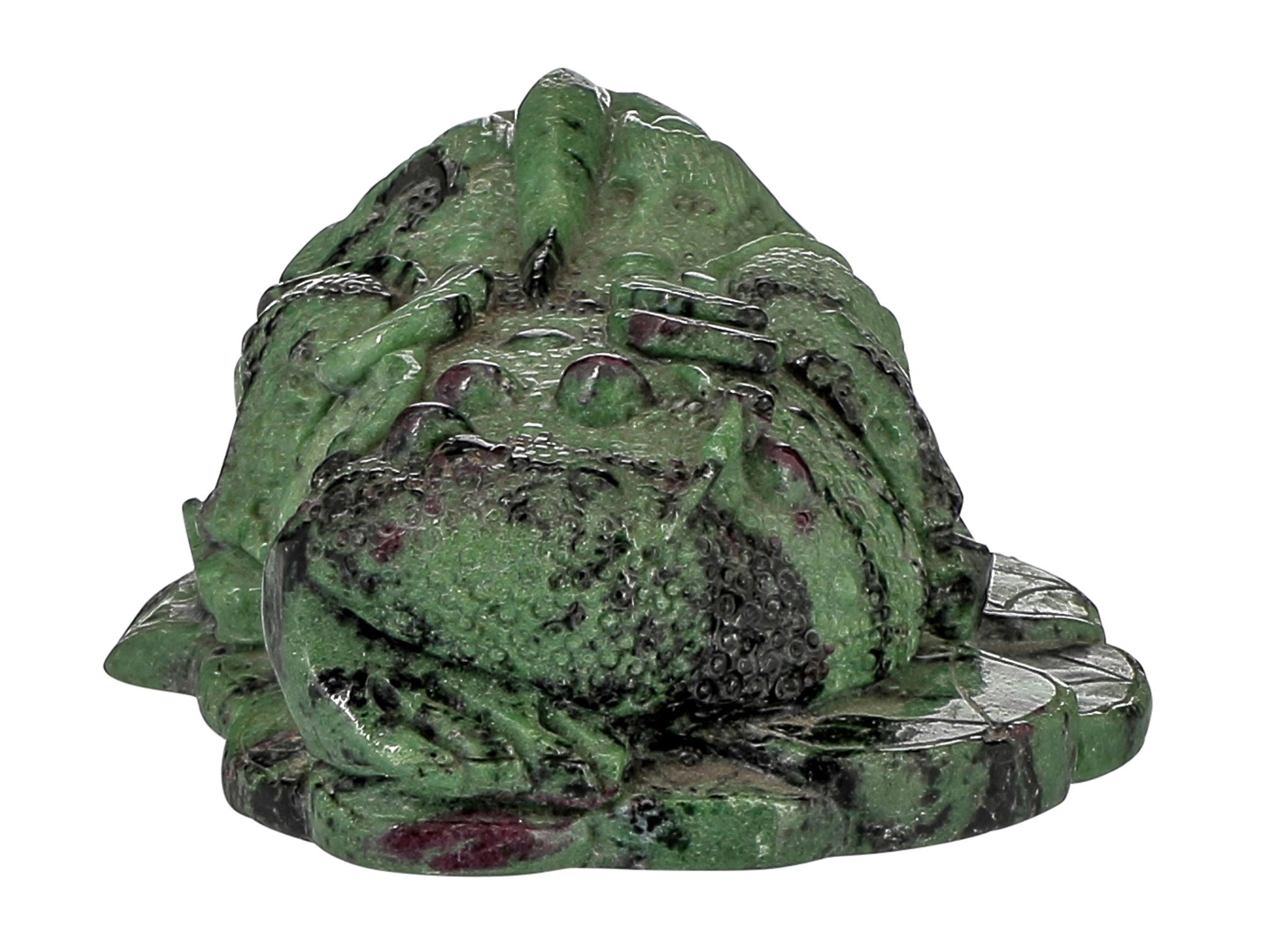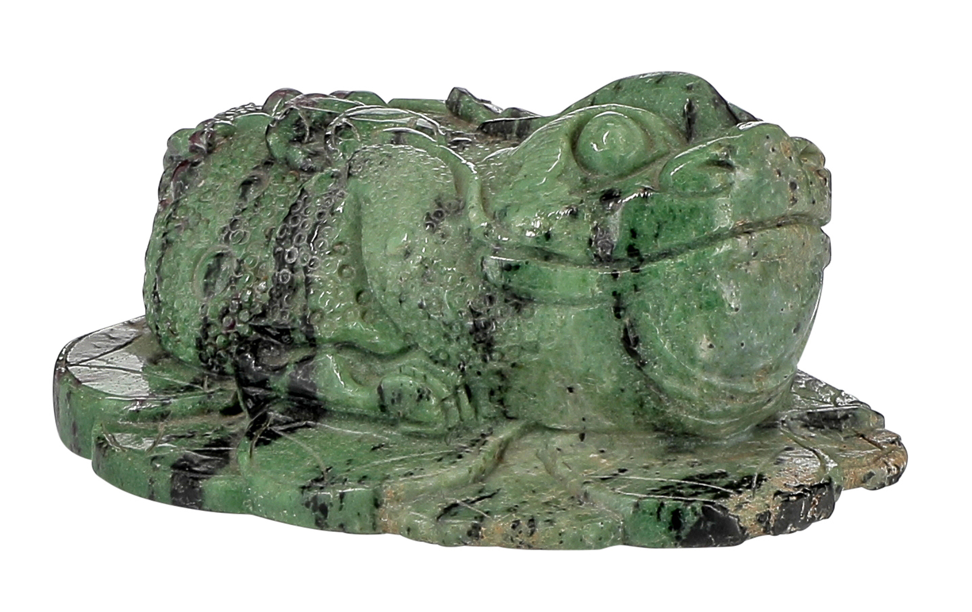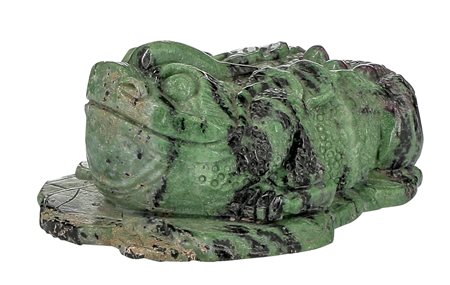 In Cina la rana è di auspicio per la ricchezza: da qui, la presenza delle monete nella piccola scultura, impreziosita anche dalle crescite di corindone, nella variante rossigna che chiamiamo comunemente rubino.