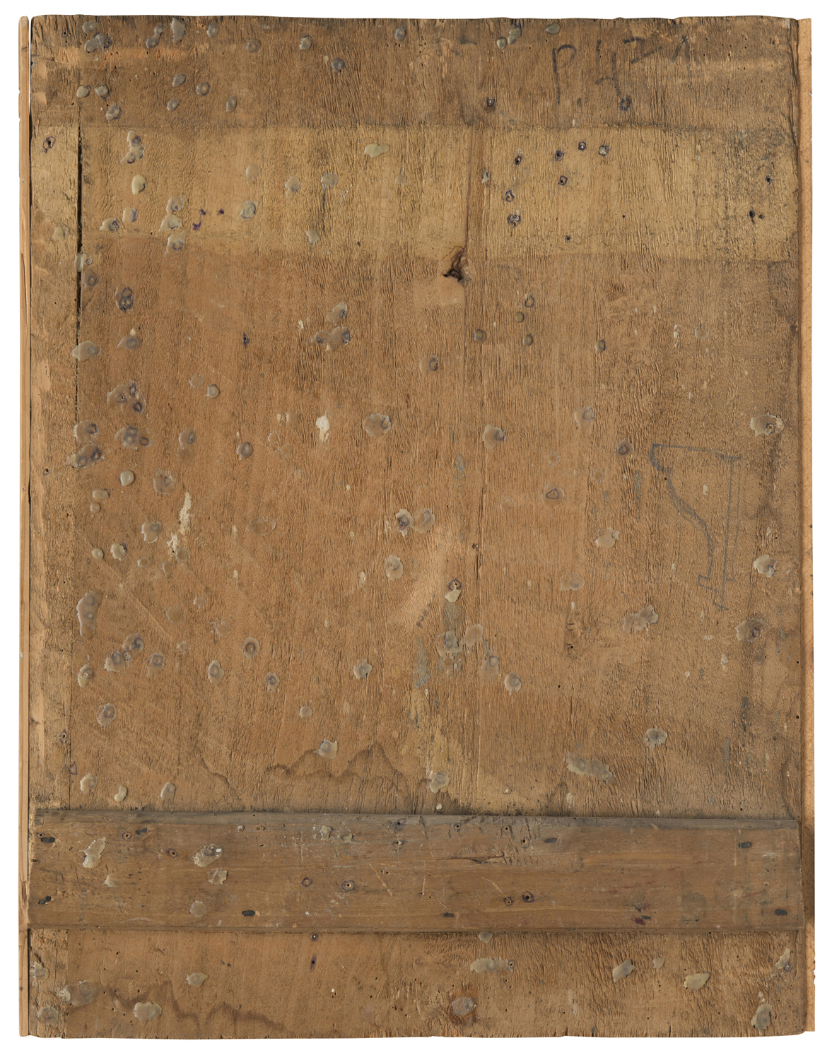 Altre iscrizioni: al verso della tavola e della cornice riferimento in pennarello “P471”, forse con riguardo ad un passaggio d’asta; Al verso della cornice un secondo riferimento “66408” (?)
