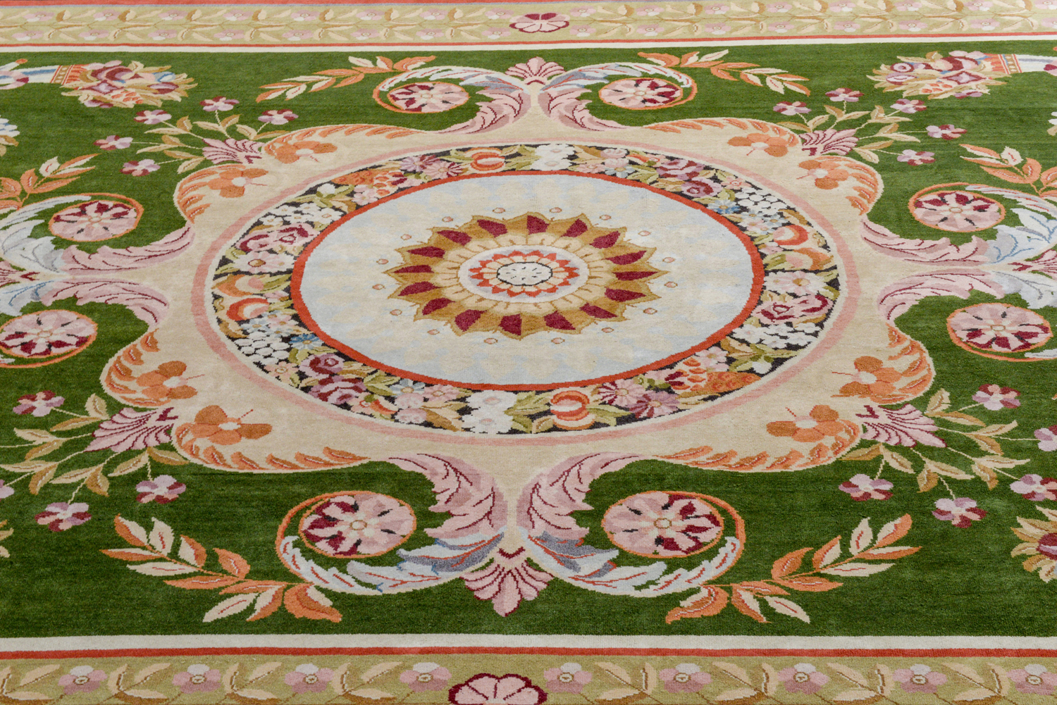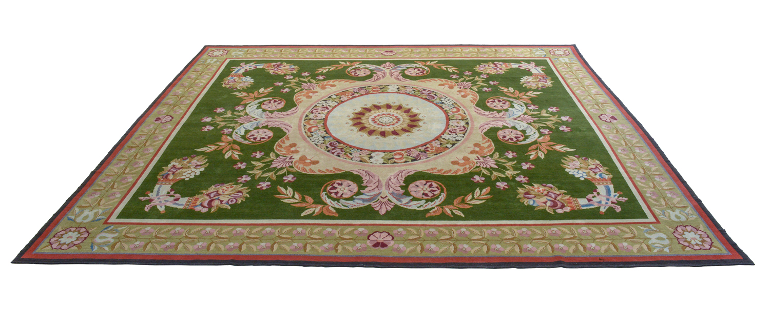Il tappeto, ritenuto novecentesco in sede di catalogazione d'asta, riprende motivi Napoleone III, tipici Aubosson o, preferibilmente Savonnerie in considerazione della annodatura del vello. L’apparato mostra un campo verde con al centro un medaglione circolare circondato da una fascia di motivi floreali, con ghirlande e cornucopie. Interessante la bordura a fondo nocciola con motivo a foglie allungate e, agli angoli, fiori a rosetta.