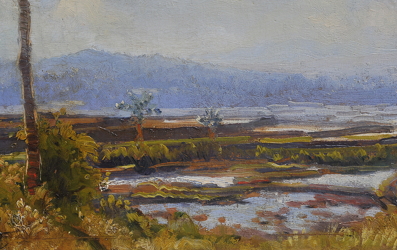 Carel Lodewijk Dake Junior (1886 - 1946) Paesaggio Sawah con un vulcano sullo sfondo