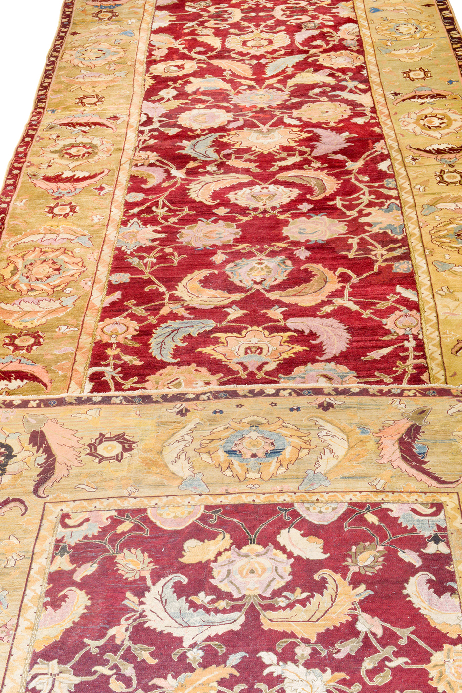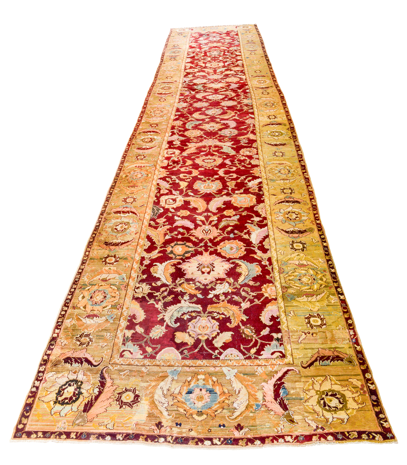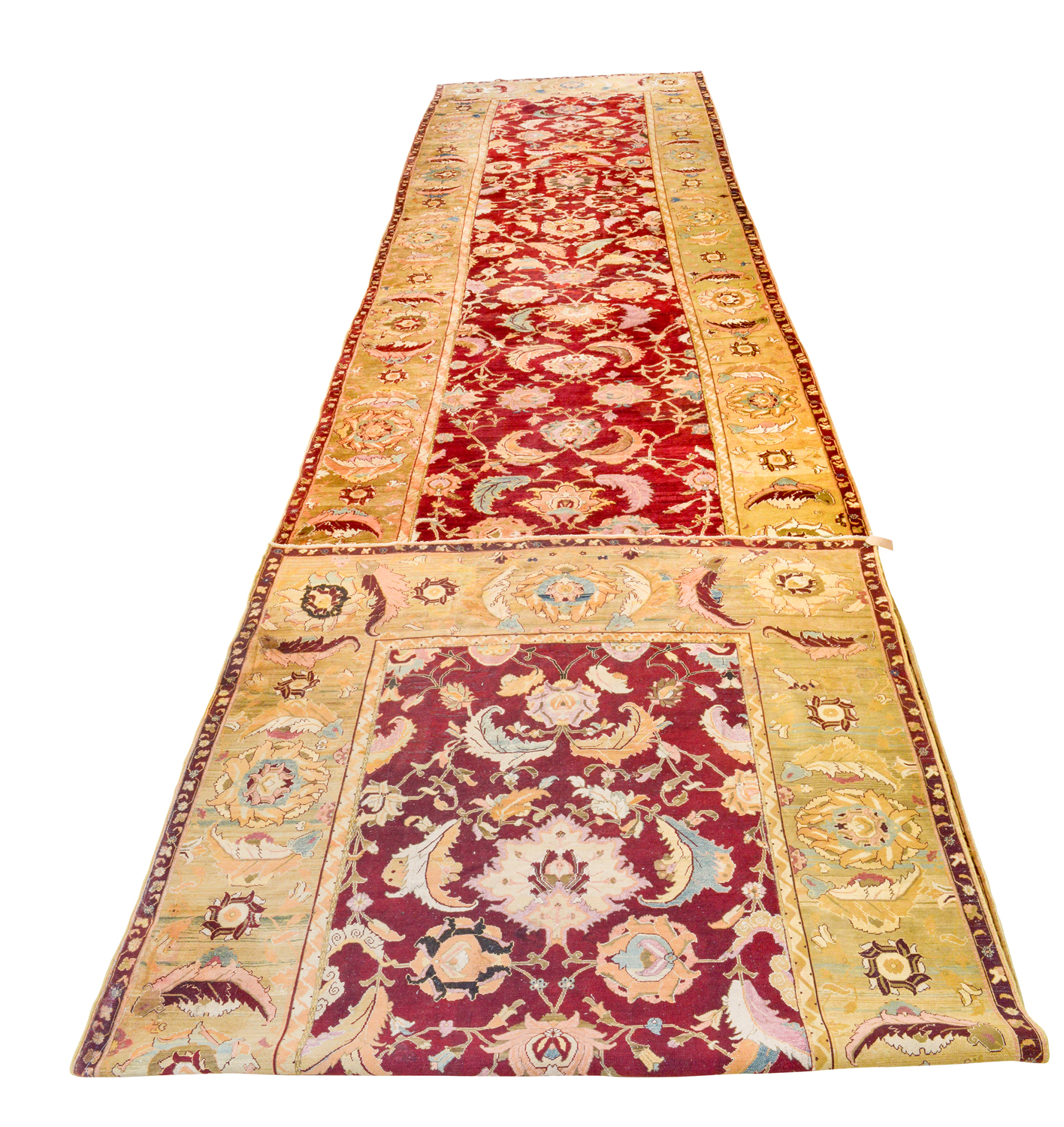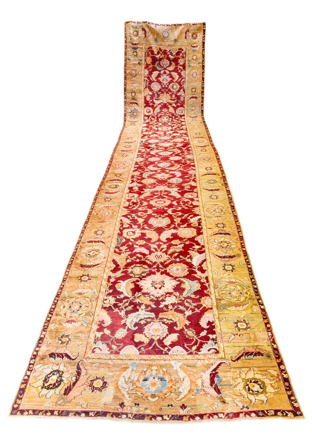 Il tappeto si sviluppa con una serie di palmette incolonnate sull’asse centrale, accompagnate da foglie arcuate. Lo stesso motivo si ripete nella bordura che però risulta essere originale soltanto nella parte sinistra. La bordura di destra è completamente ritessuta, il che induce a pensare che il tappeto in origine avesse formato completamente diverso e non di corsia.
