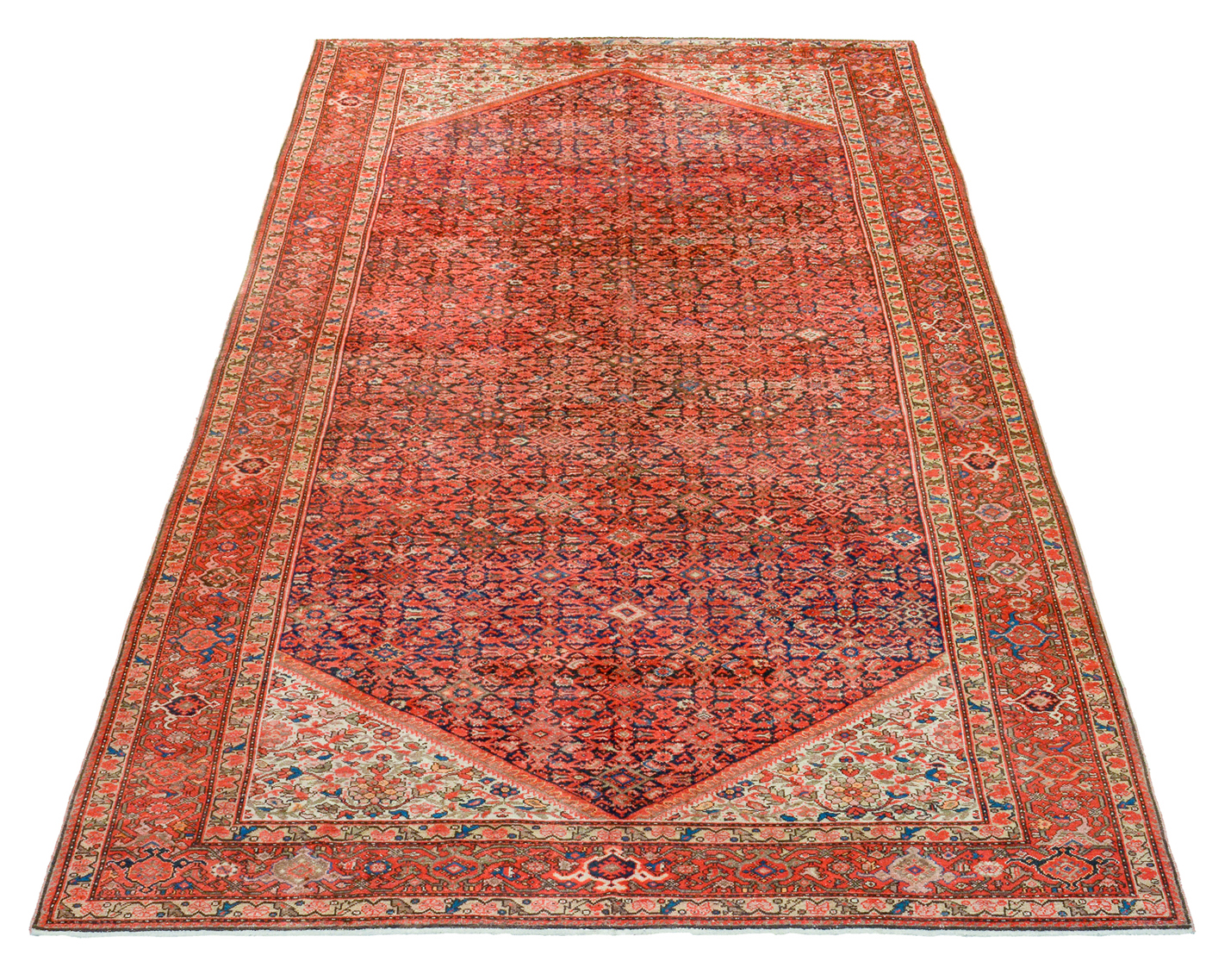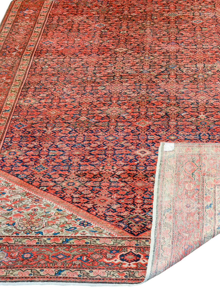 Classico esemplare con motivo cosiddetto Herati sia nel campo (a losanghe e foglie arcuate, o Mahi, pesci) sia nella bordura (a palmette, detto a tartarughe) e con cantonali a fondo bianco.