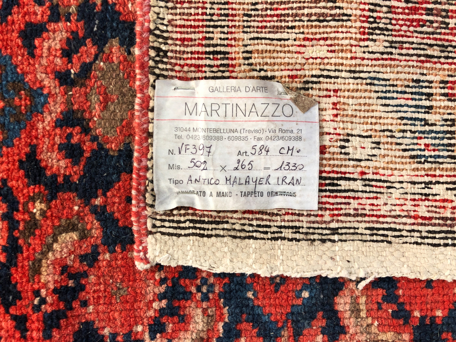 Elementi distintivi: etichetta con riferimento alla Galleria d’Arte Martinazzo, Montebelluna, e ai dati del tappeto