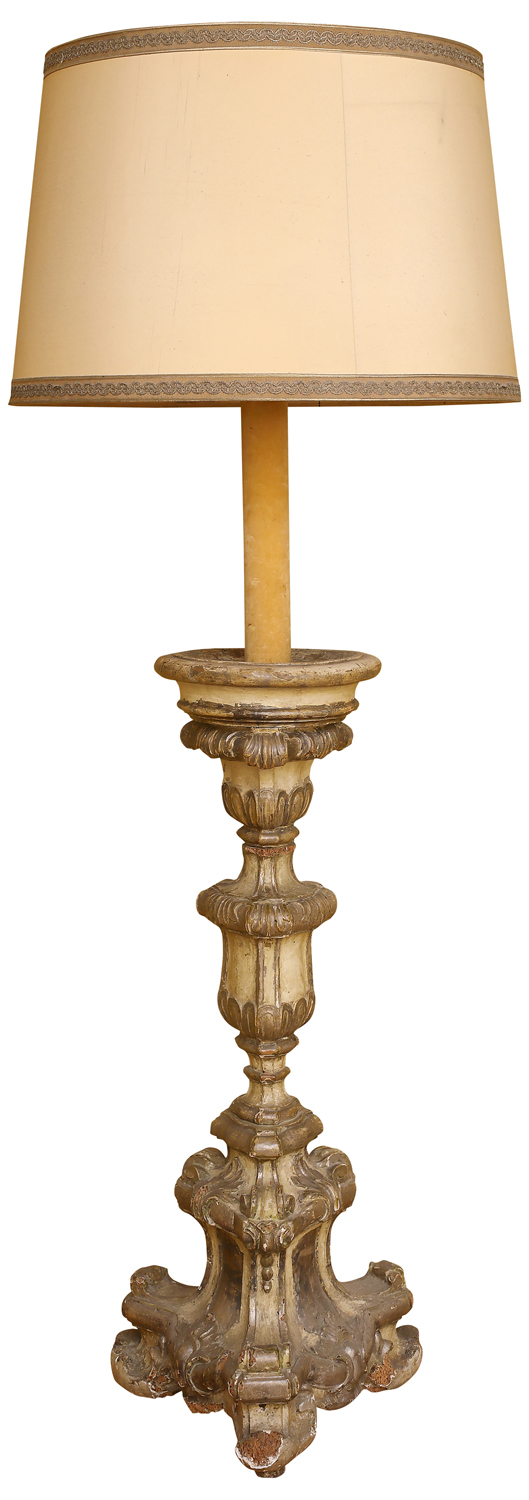 Elegante piantana a base tripode, decorata con motivi floreali, munita di estensione e paralume moderno.