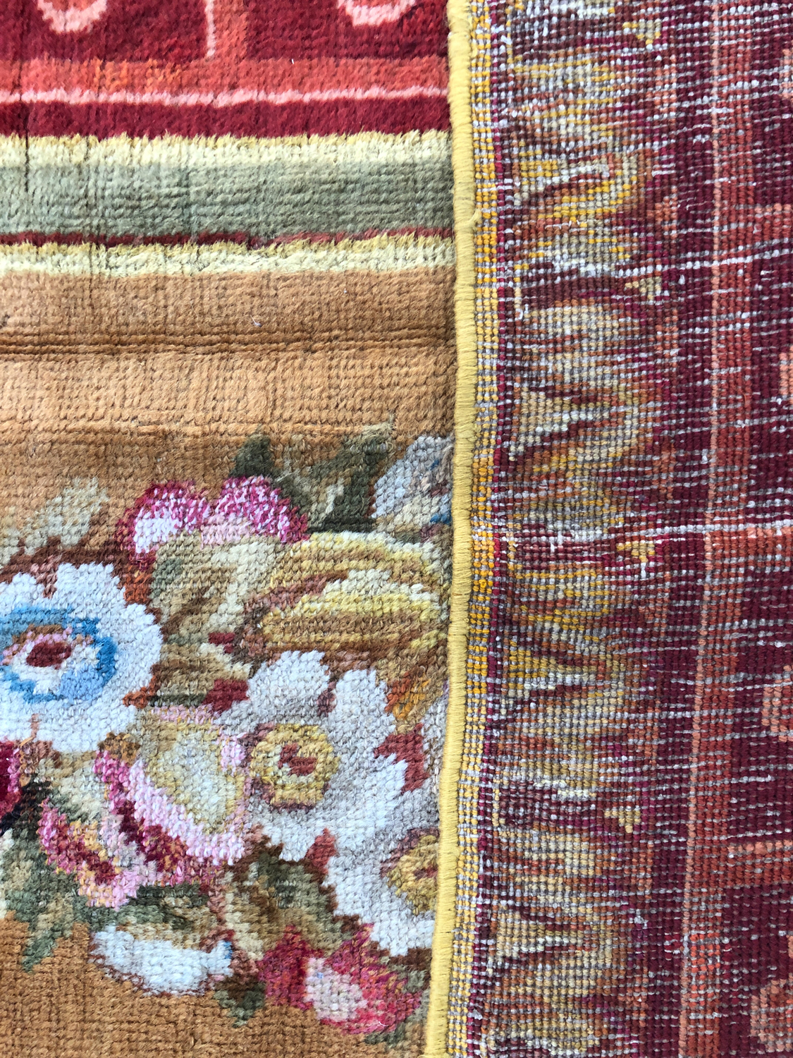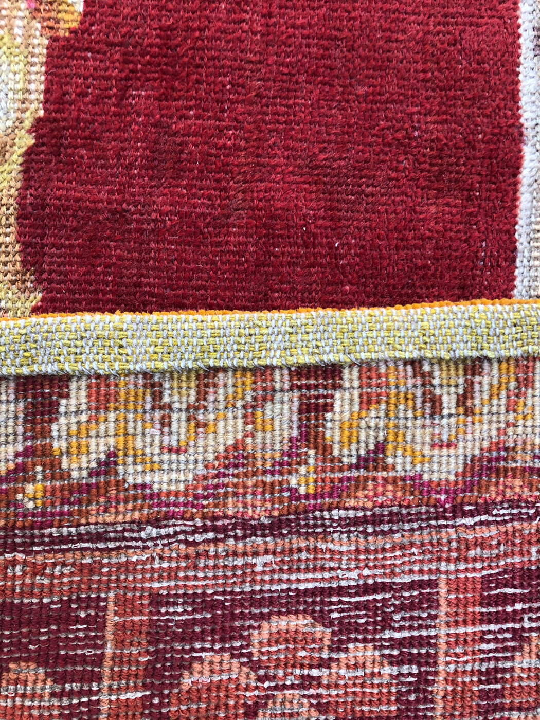 Stato di conservazione. Superficie: 50% (restauri di epoche diverse, in particolare perimetro ritessuto e riannodato e medaglione centrale restaurato successivamente con punti sumakh)