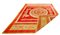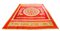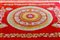 Tappeto con disegno a medaglione circolare su fondo rosso corallo, circondato da festoni floreali con due pannelli laterali a fiori e fondo con motivo a rosette a riquadro.