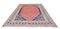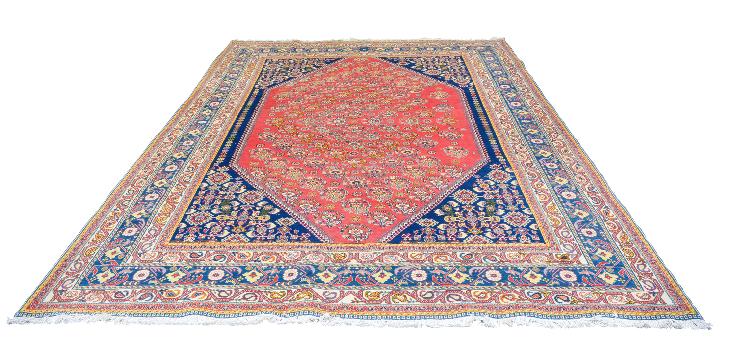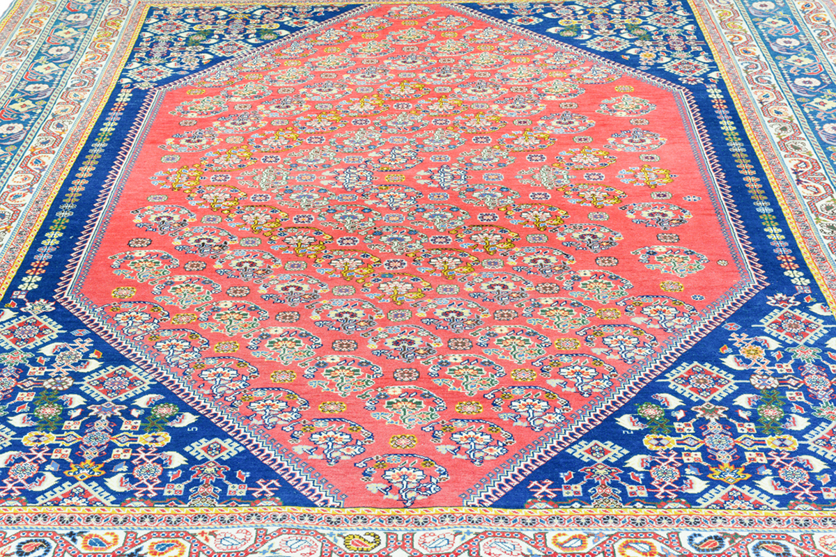 Sul campo a fondo blu, è appoggiato un grande medaglione a esagono allungato di colore rosso, contenente motivi boteh floreali nello stile tipico dei tappeti Qashqa’i.
