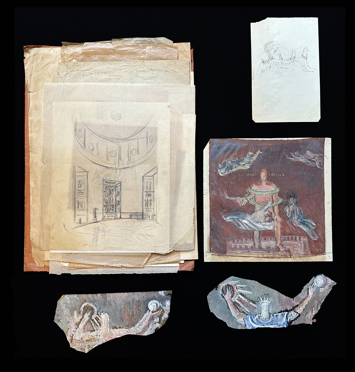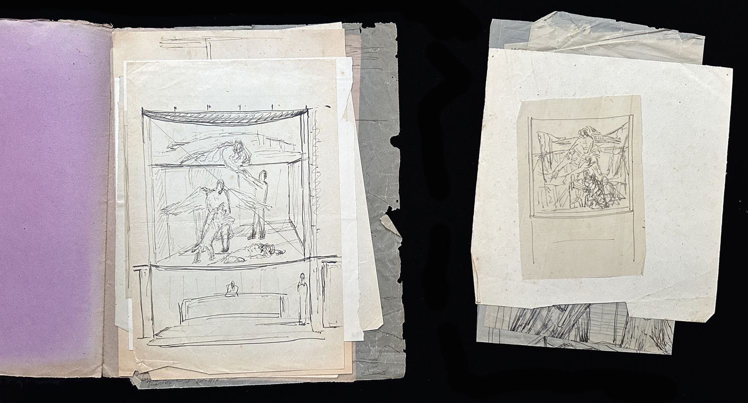 Selezione di appunti grafici sia di invenzione sia di natura progettuale. I fogli provengono dal patrimonio di Carlo Castria (1883-1970), storico legale di Ferruccio Ferrazzi e collezionista appassionato, soprattutto di arte moderna.