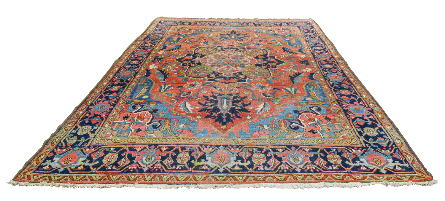 Insolito tappeto di Heriz a grana piuttosto grossa, con un curioso medaglione centrale di forma tondeggiante, accompagnato da due palmette che fungono da pendenti.