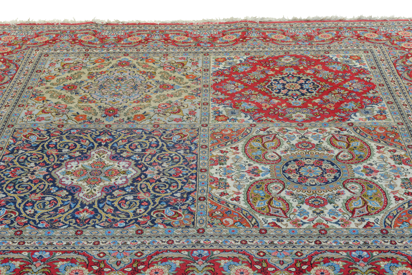 Il campo di questo tappeto è diviso in quattro settori, ciascuno dei quali contiene un diverso disegno di medaglione con fondo di colore variato, una sorta di campionario.