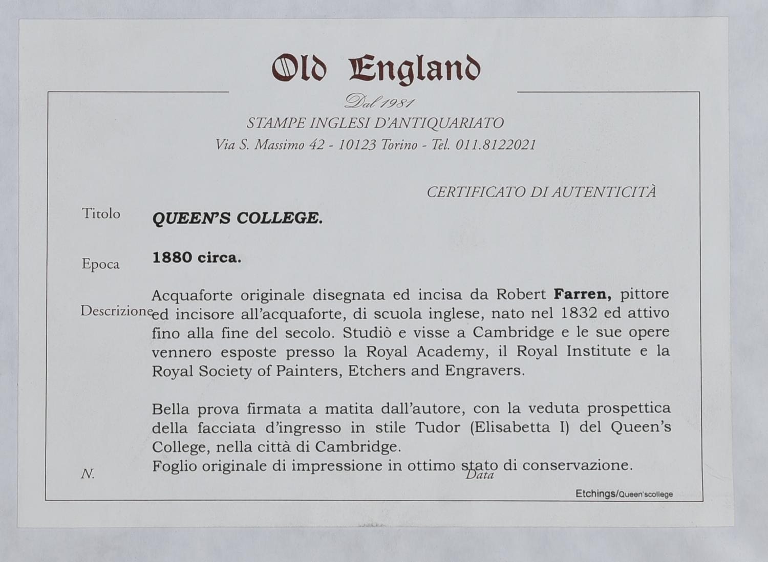 QUEEN'S COLLEGE, 1880 acquaforte, cm 39,6x29,7 (con cornice) firma...
