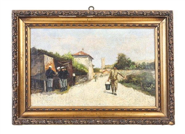 Scuola del secolo XIX "Il rancio" olio su tela (cm 35x56) in cornice (difetti