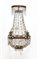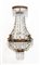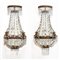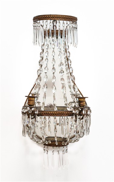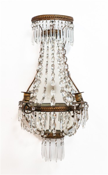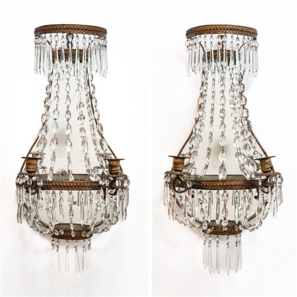 Coppia di applique a due luci in lamierino perlinato su fondo sagomato e specchiato, raccordi e pendenti in vetro sfaccettato (h cm 51) (difetti)