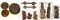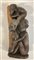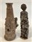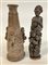 Arte africana. Lotto composto da un vaso in terracotta con figure di scimmie in altorilievo, due sculture lignee, tre sculture in pietra con figure maschili e femminile, tre vassoi con tese intagliate e due sonagli in legno e metallo (d mx cm 44) (difetti e mancanze)