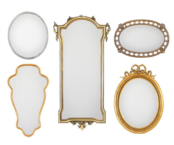 Lotto di cinque diverse specchiere di cui una in legno dorato con cornice traforata (cm 105x73), una in materiale sintetico sormontata da fiocco ( cm 100x72), una con cornice in metallo (cm 50x42) e due sagomate e dorate (difetti, una mancante della cimasa)
