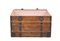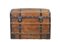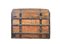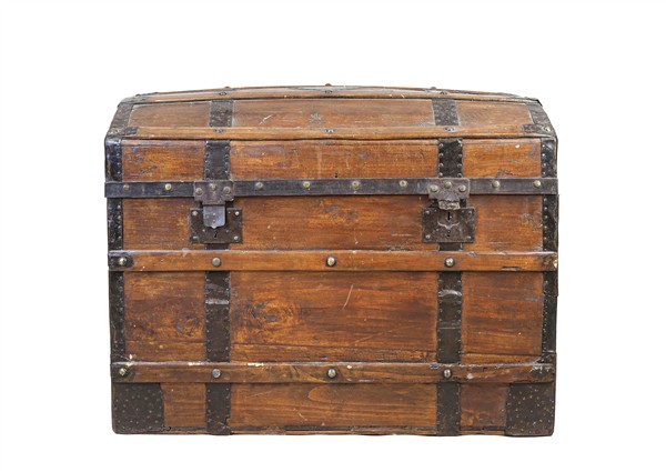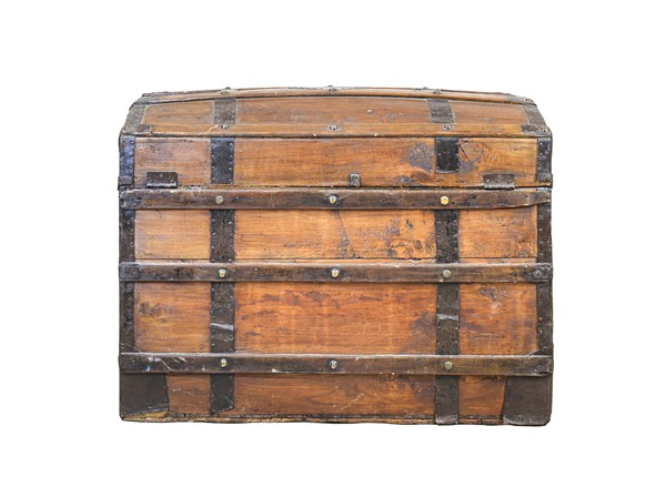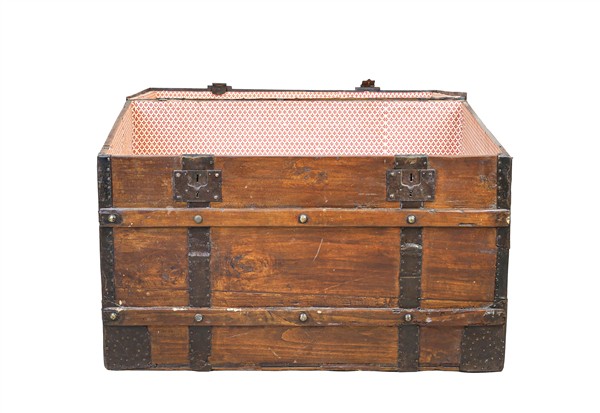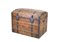 Baule in legno con coperchio bombato e bordure in metallo borchiato e rivettato